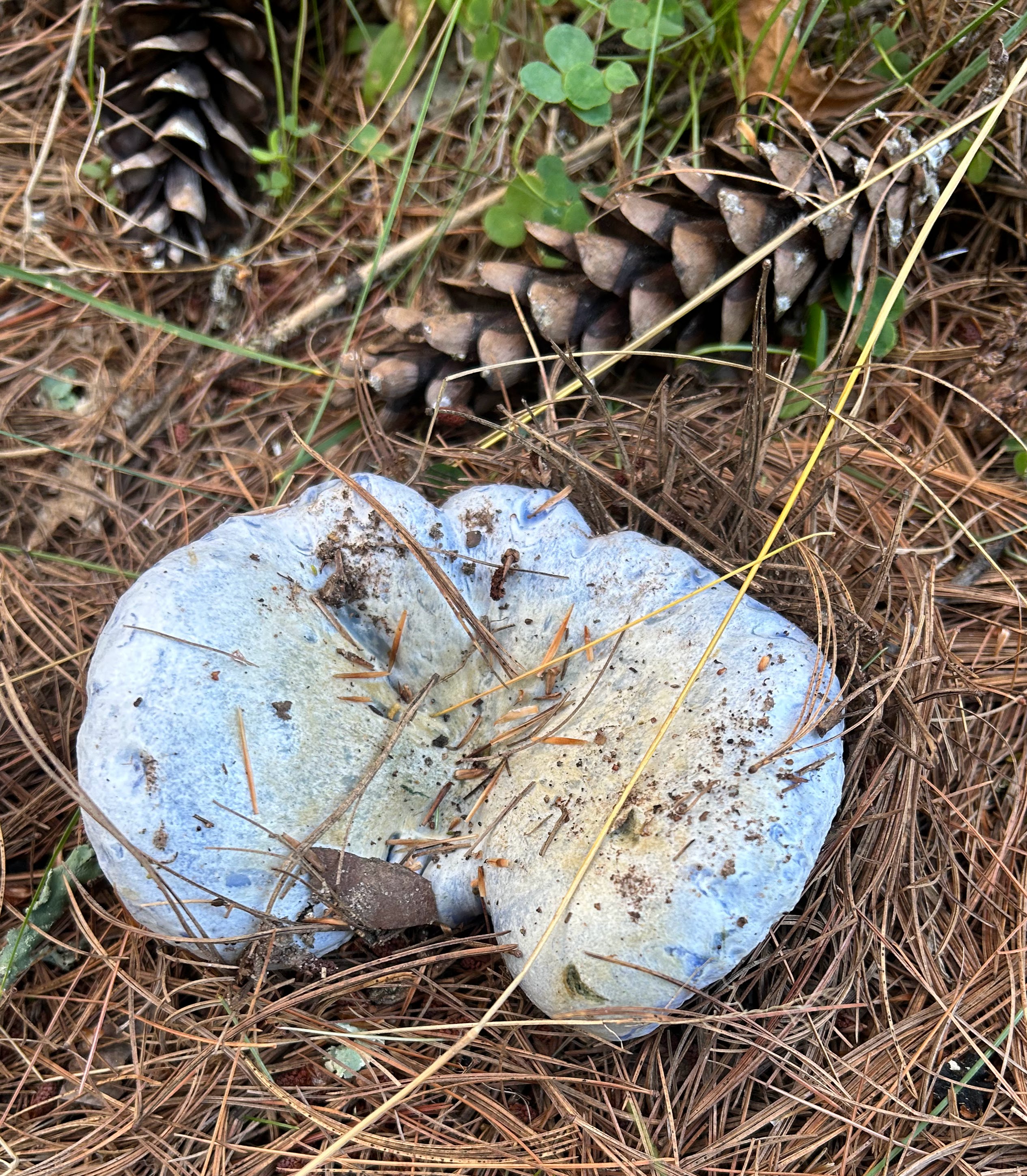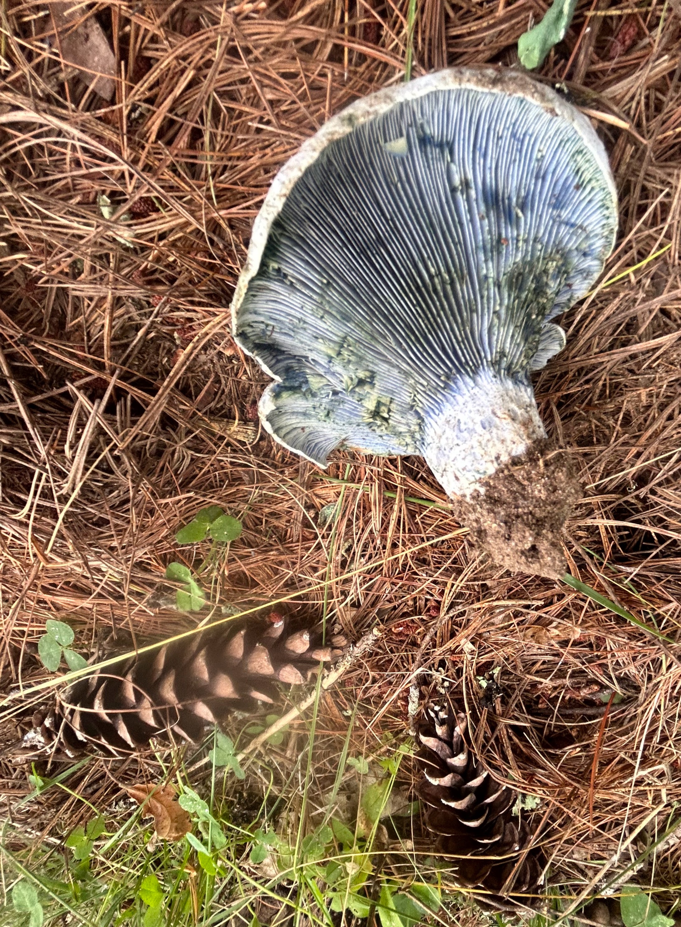 We first noticed this indigo milk cap September 5, 2024. You can see that it is right next to pinecones dropped from nearby Eastern White Pine trees.