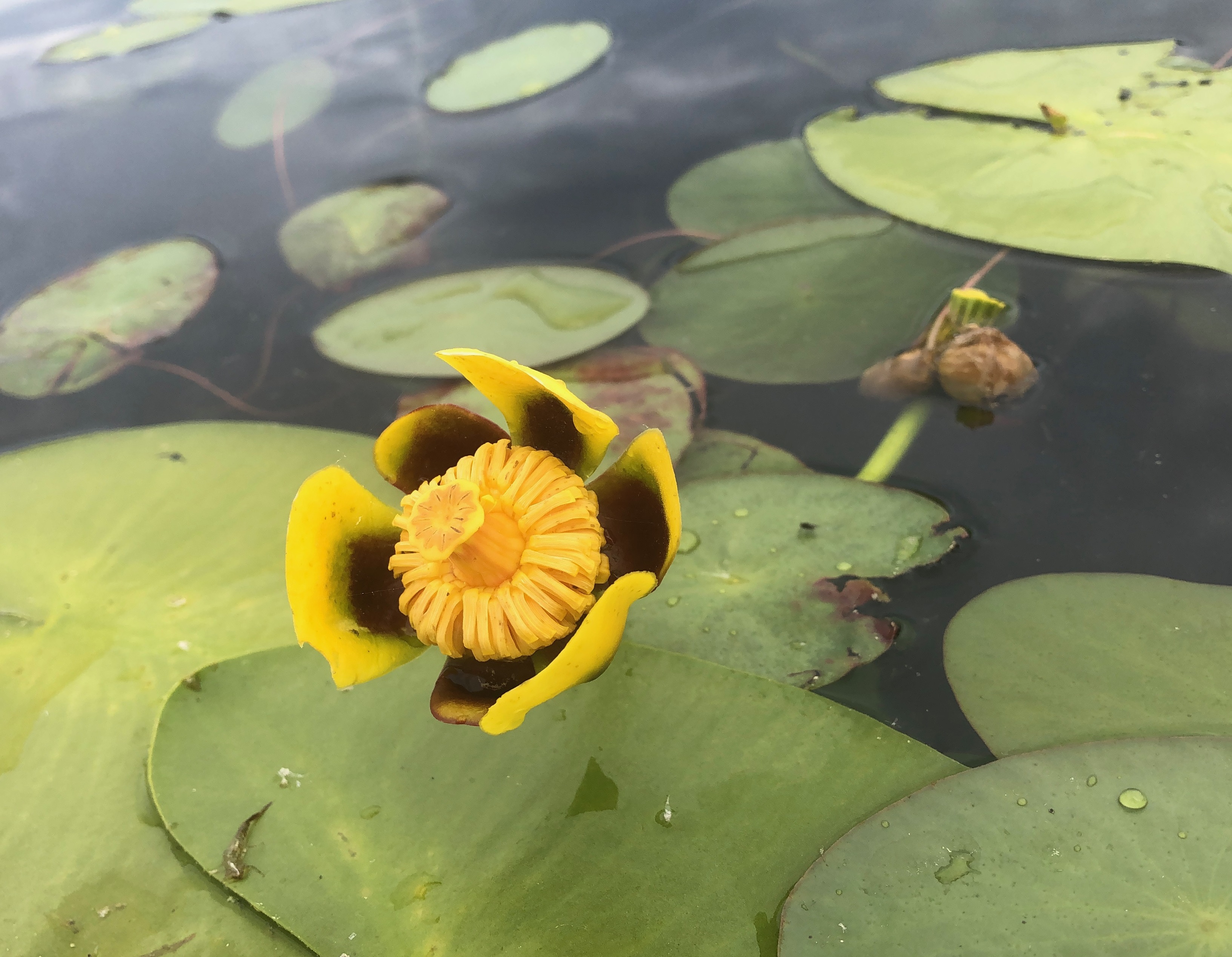 In Big Bass Lake these Yellow Pond Lilies (a.k.a Water Cabbage, Cow Lily, Frog Lily) were interspersed with the more common white water lilies (Nymphaea odorata).
