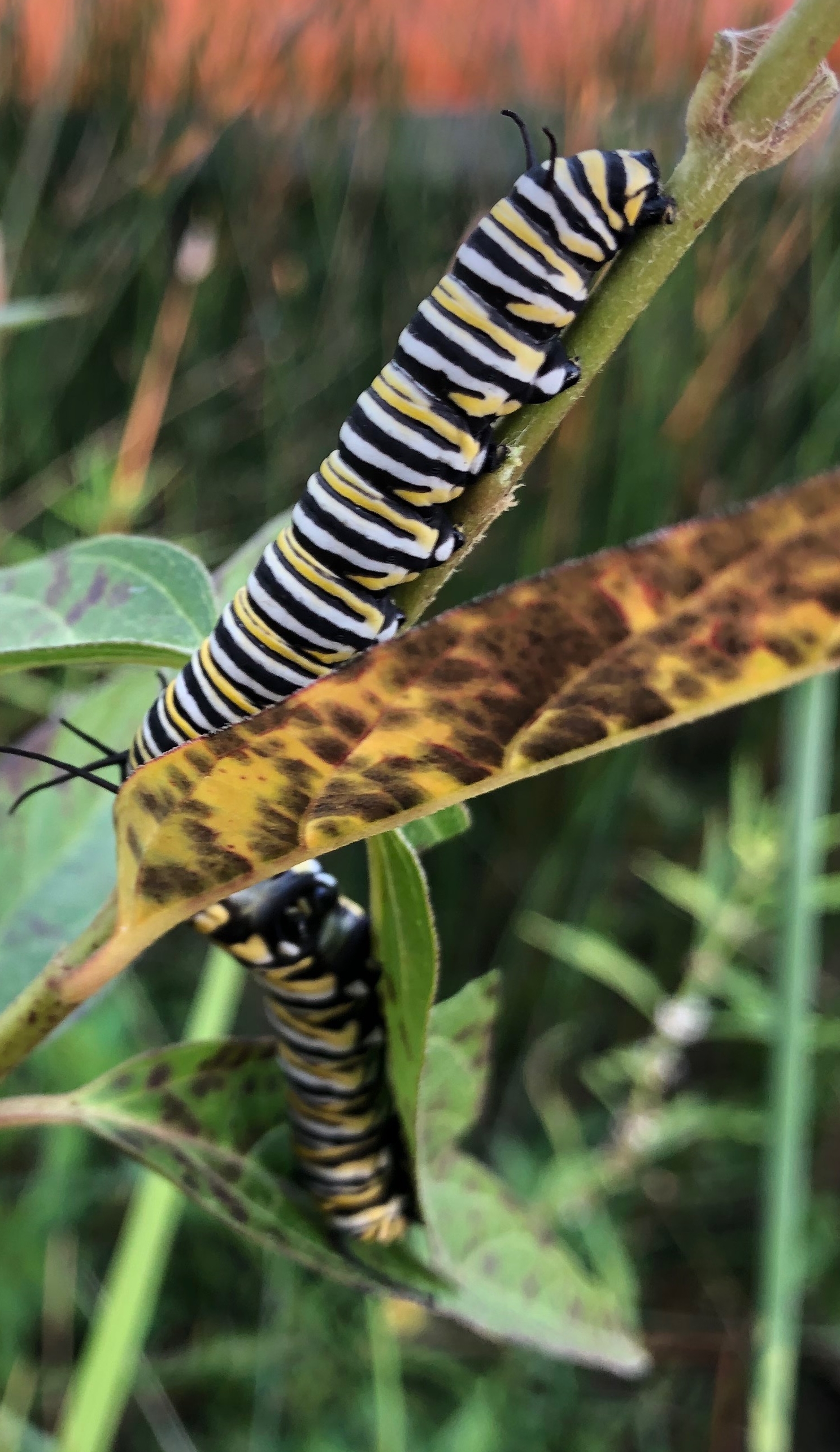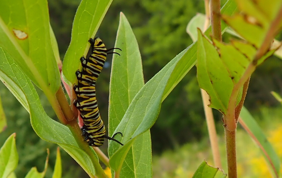 Here is a similar show-and-tell. Today I’m showing the caterpillars on their Swamp Milkweeds; hoping to return later to capture the metamorphosis.
