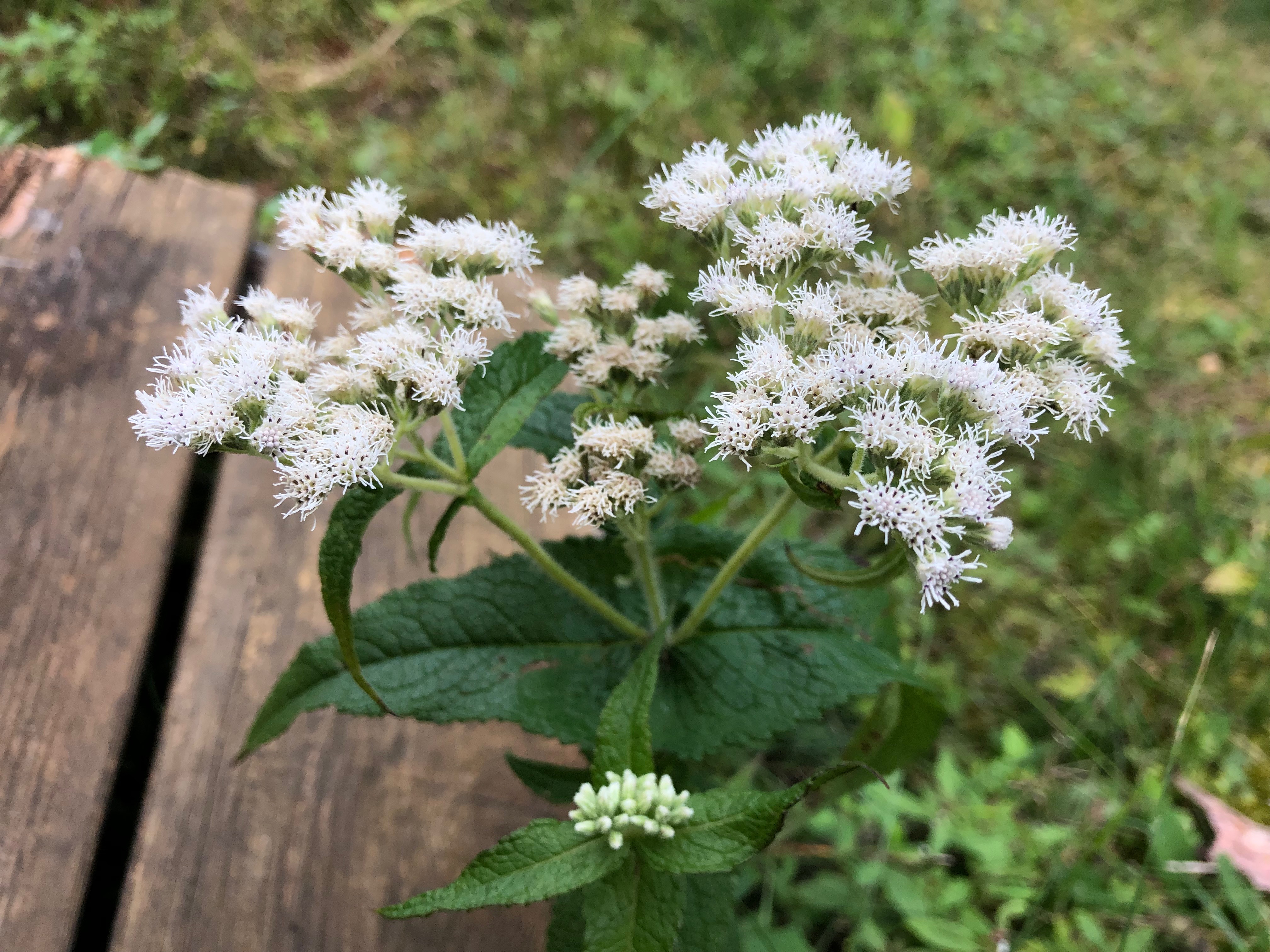 Boneset is a native plant found throughout Minnesota and the eastern United States. In the picture to the left above, its stem appears to be growing through two fused opposing leaves. This characteristic suggested to ancient herbalists that boneset could be useful in mending broken bones. This claim is very questionable, but boneset has been used through the years as a remedy for colds, fevers, and other ailments