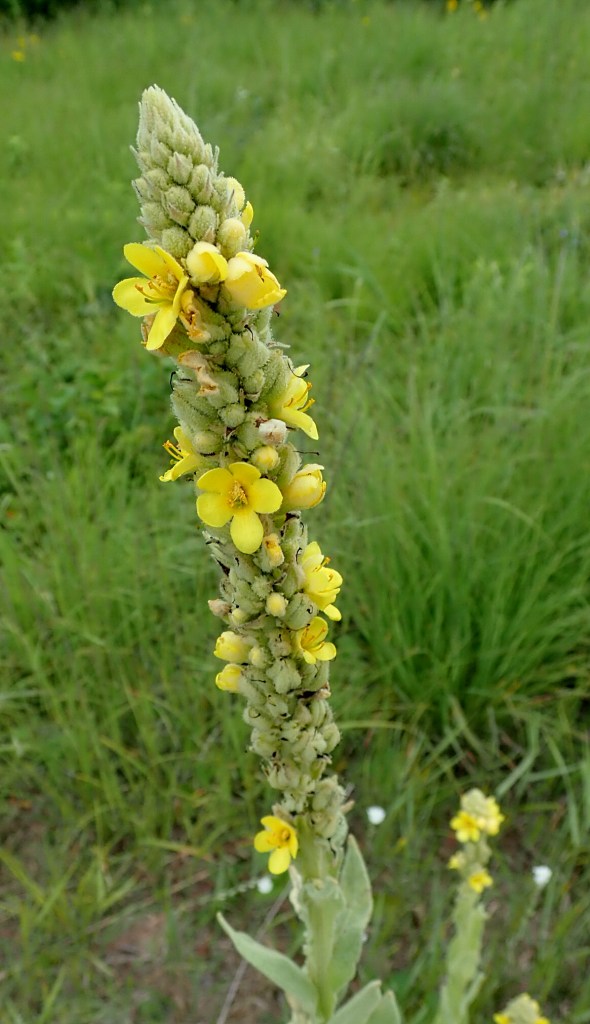 Mullein was featured in a previous post, prior to its bloom. That post focused on the utility of its velvety leaves (Nature’s Charmin). But, it also has interesting flowers, as shown in the photo to the left.