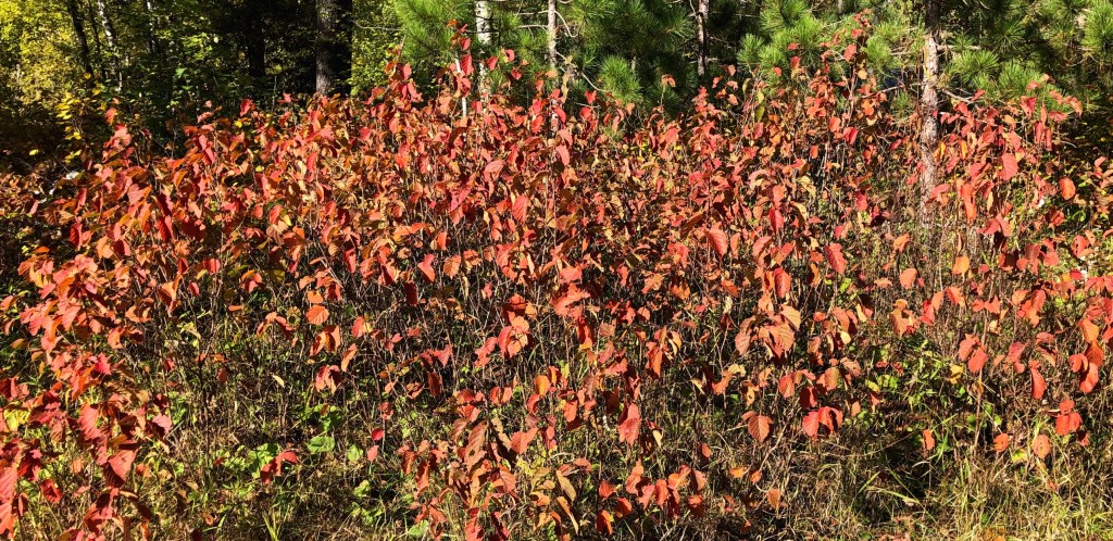 Hazelnut bushes in the two photographs above are directly across an east-west road from each other. The side of the road with the southern, sunny exposure has hazelnut bushes that have turned reddish. The other side with less sun, has bushes that have turned yellow.