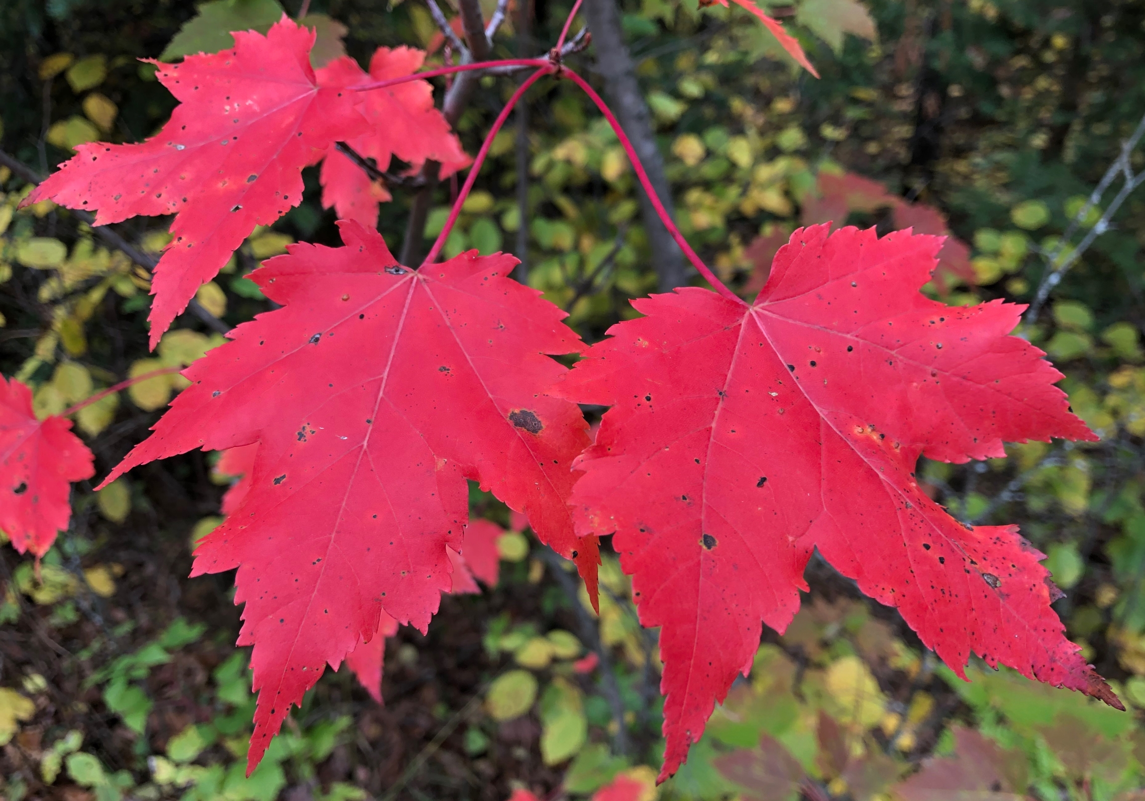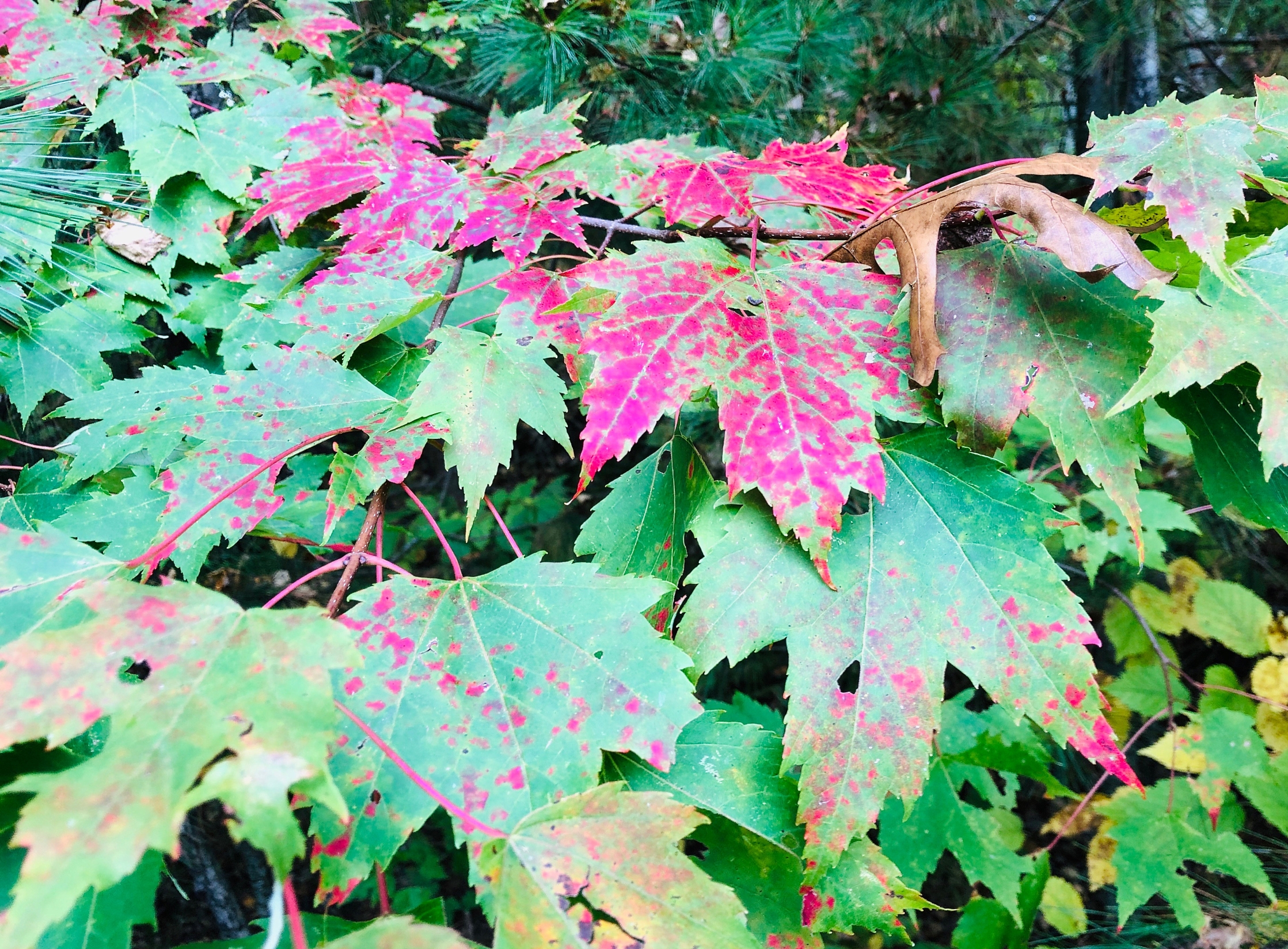 Maple leaves with yellow, red, and green colors reflect different proportions of carotenoids, anthocyanin, and chlorophyll.