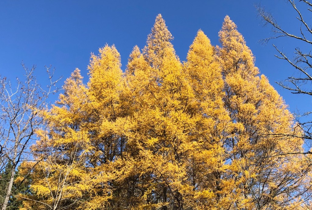 Tamaracks that have turned yellow in fall are very striking trees. These tamaracks photographed on October 18 are near Williams Lake in Hubbard County, Minnesota.
