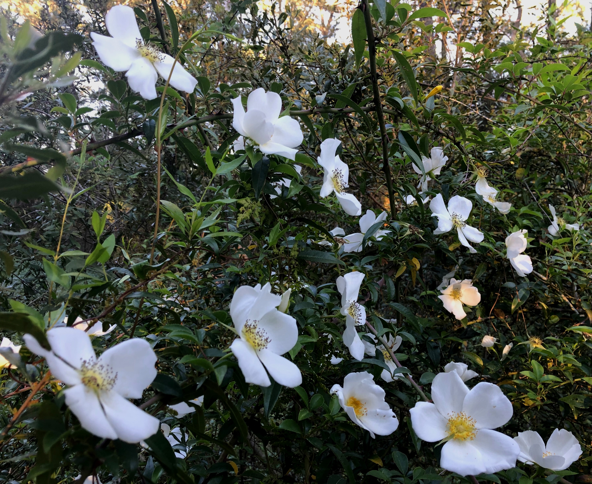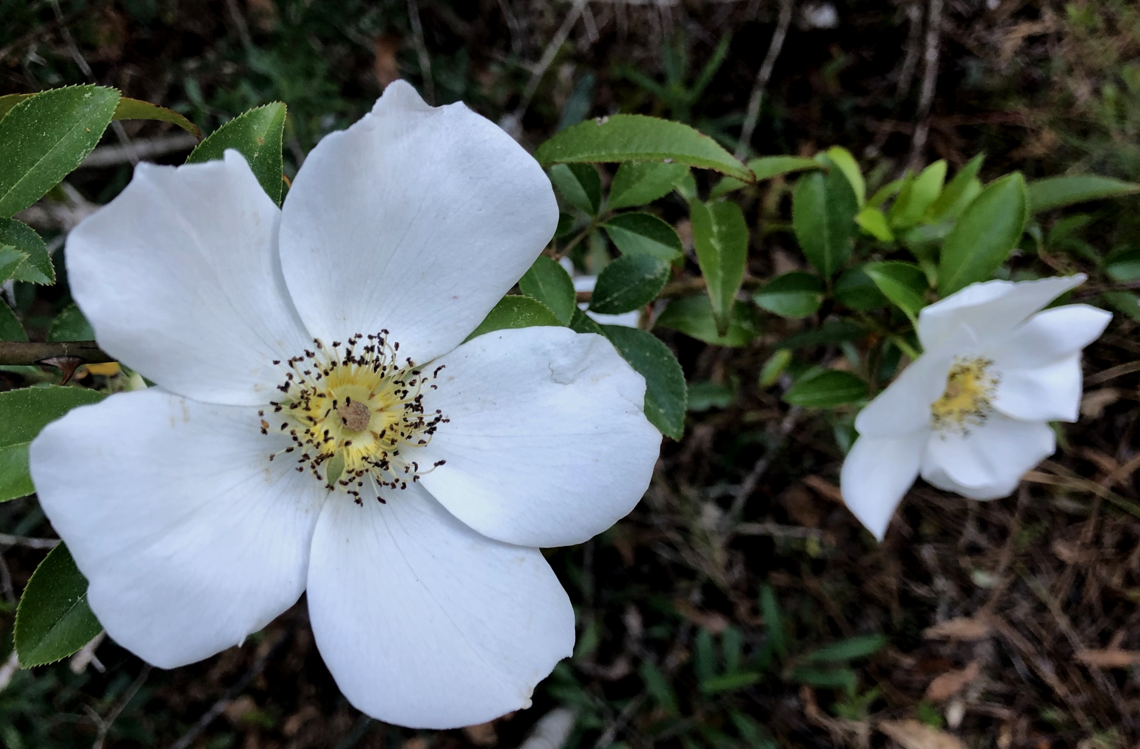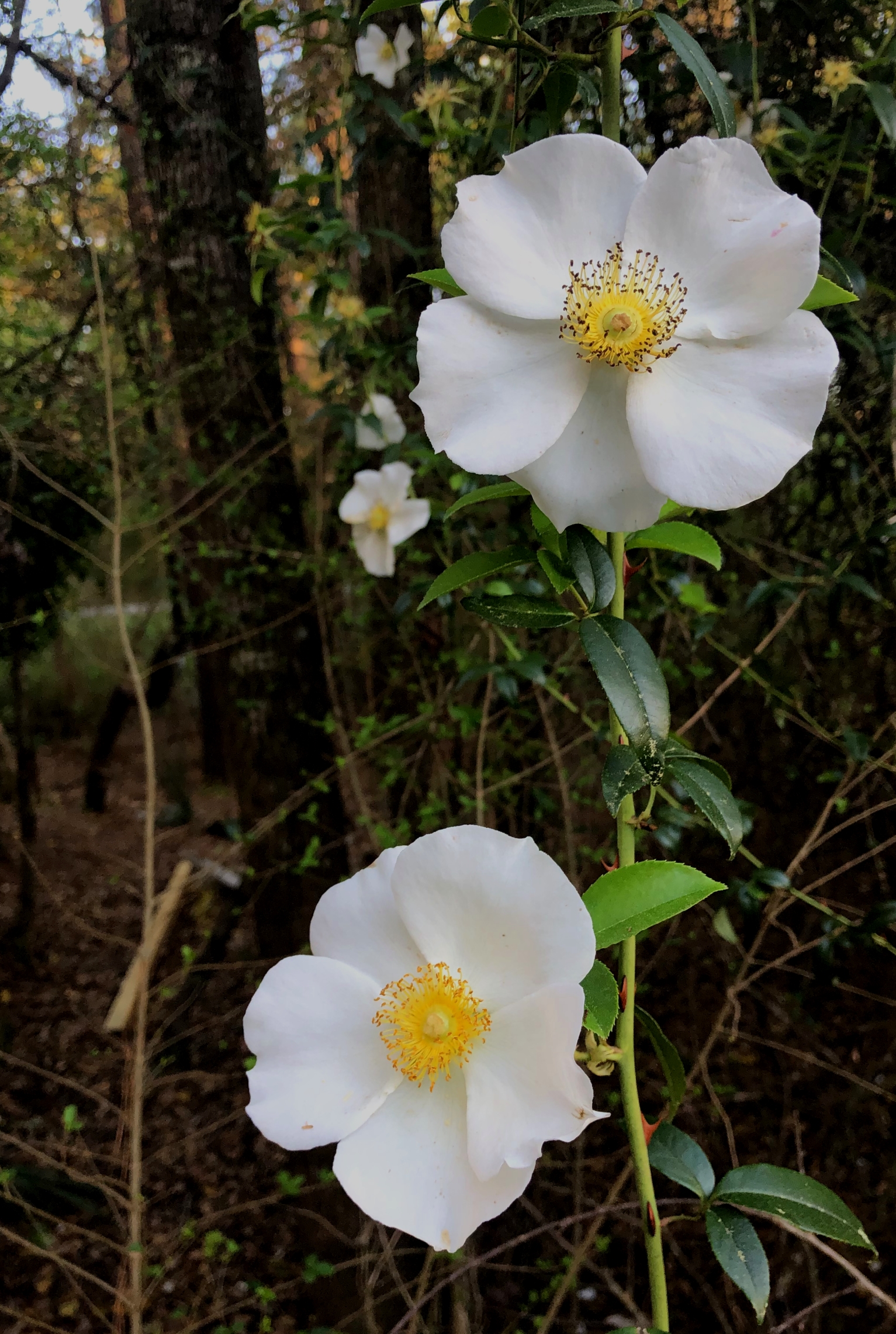 White blooms of the Cherokee Rose (Rosa laevigata) are a common sight along southeastern Louisiana roadways in early March. A native of southeast Asia, in the United States it is an invasive species. It has thrived in the southern US since its introduction here long ago (~1780), and was adopted as the state flower of Georgia in 1916.