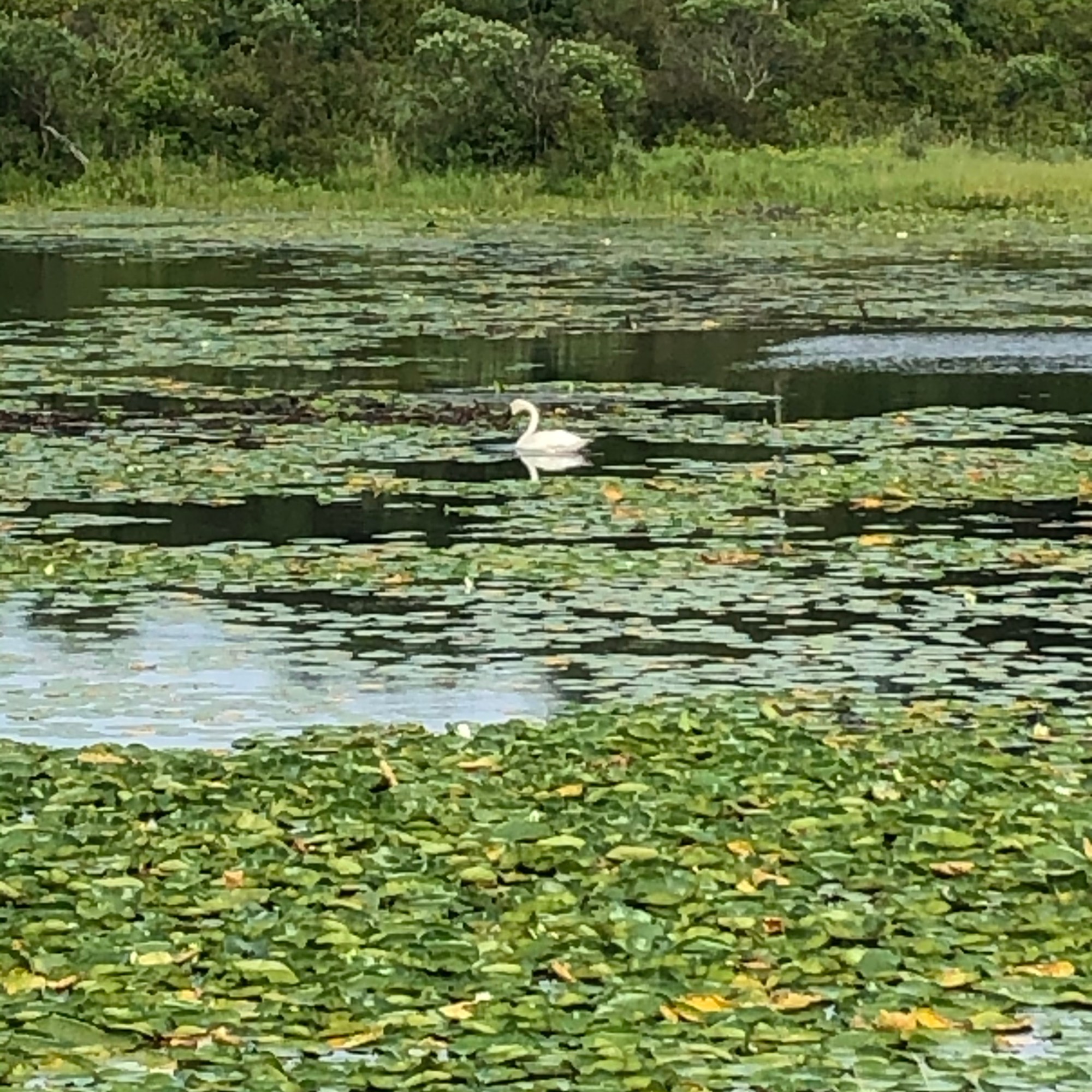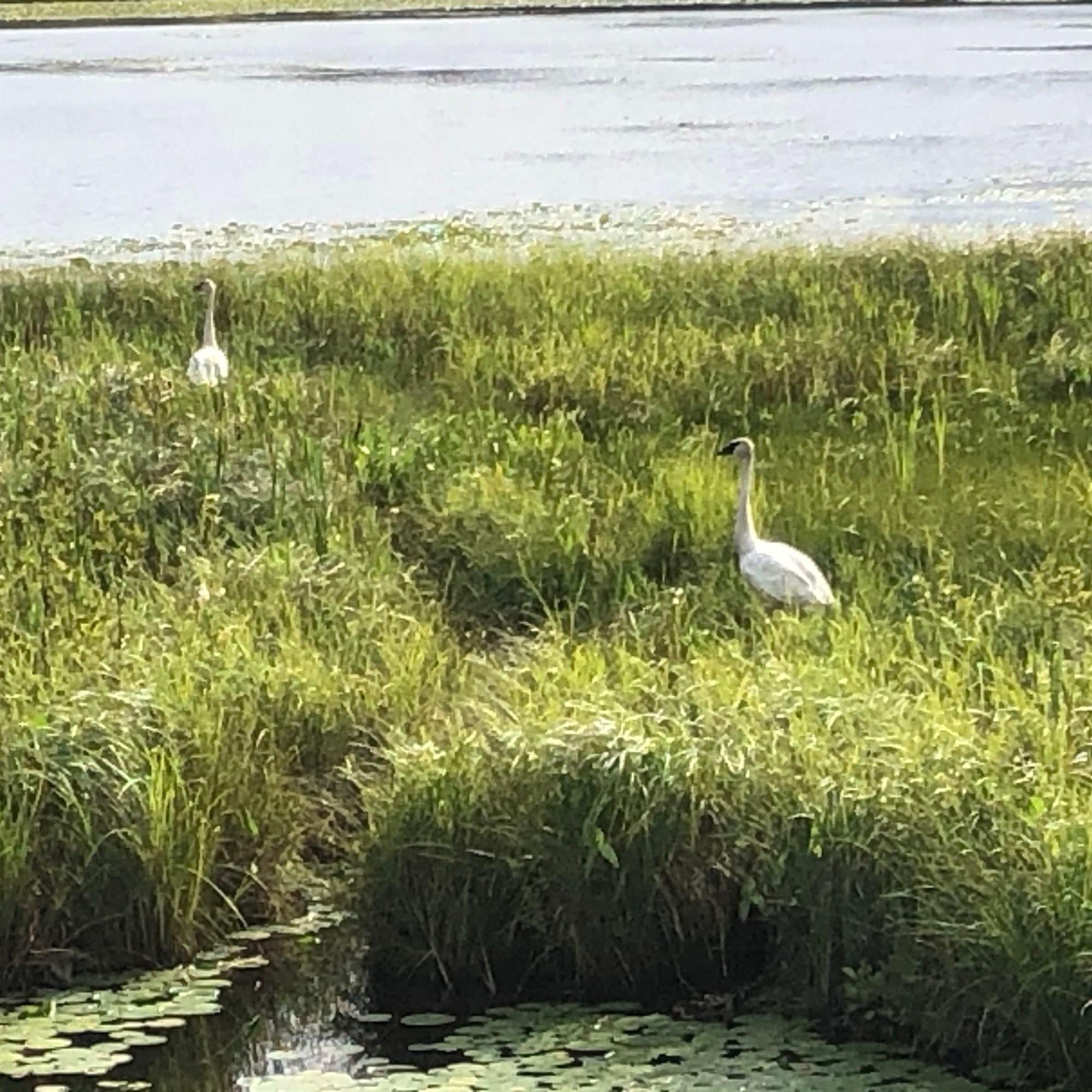 Young swans are known as cygnets, a name derived from the swan genus Cygnus. These two were seen in a pond next to the Paul Bunyan trail in north-central Minnesota, their parents stayed at a distance.