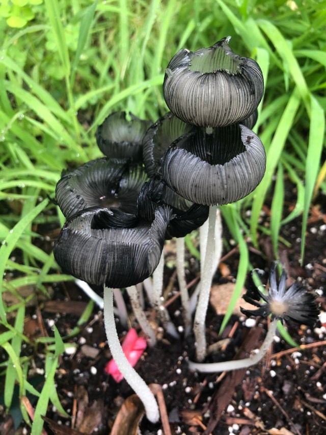 These small mushrooms were growing on wood chip mulch in our garden. They most likely are Coprinopsis lagopus, commonly known as the hare-foot mushroom. These mushrooms last only a few hours before they dissolve into an inky mess.