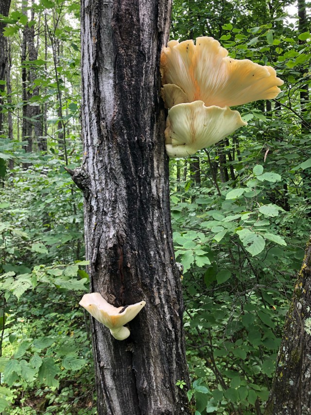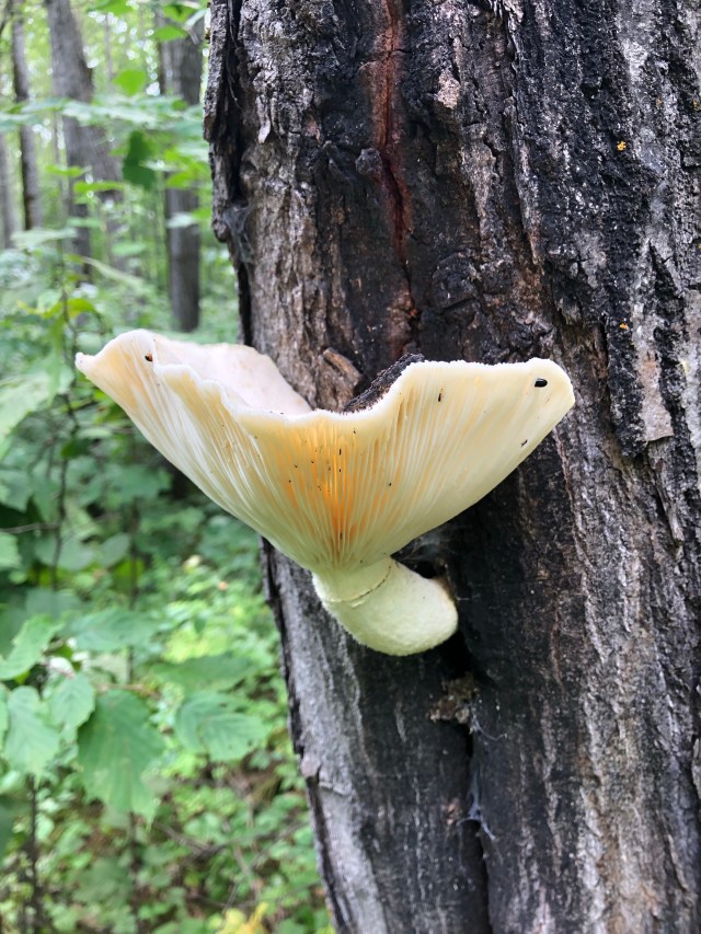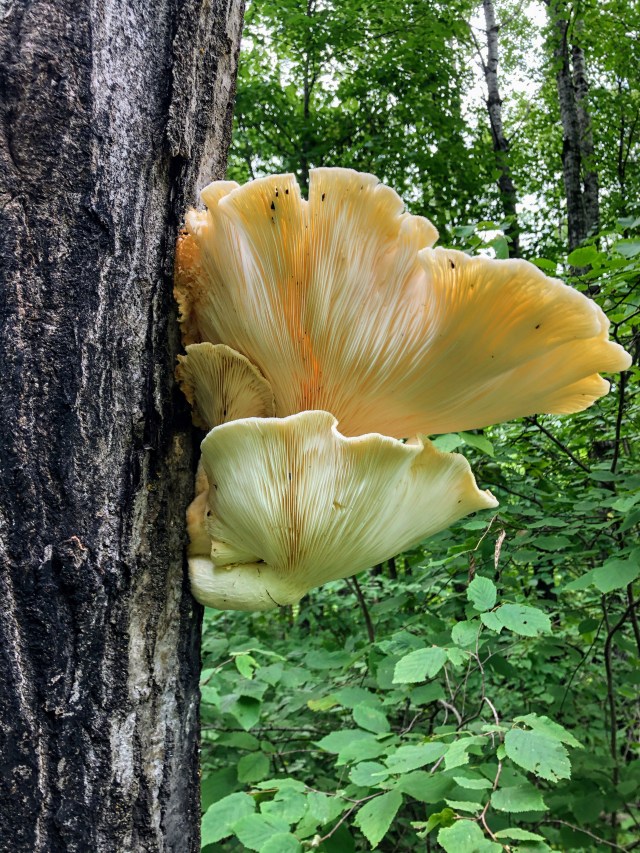These large mushrooms were found growing from a standing dead tree in the Chippewa National Forest, near Walker, Minnesota. They are Pleurotus dryinus, or Veiled Oyster mushrooms. This mushroom is most often found growing on decaying wood of oak, ash and beech trees.