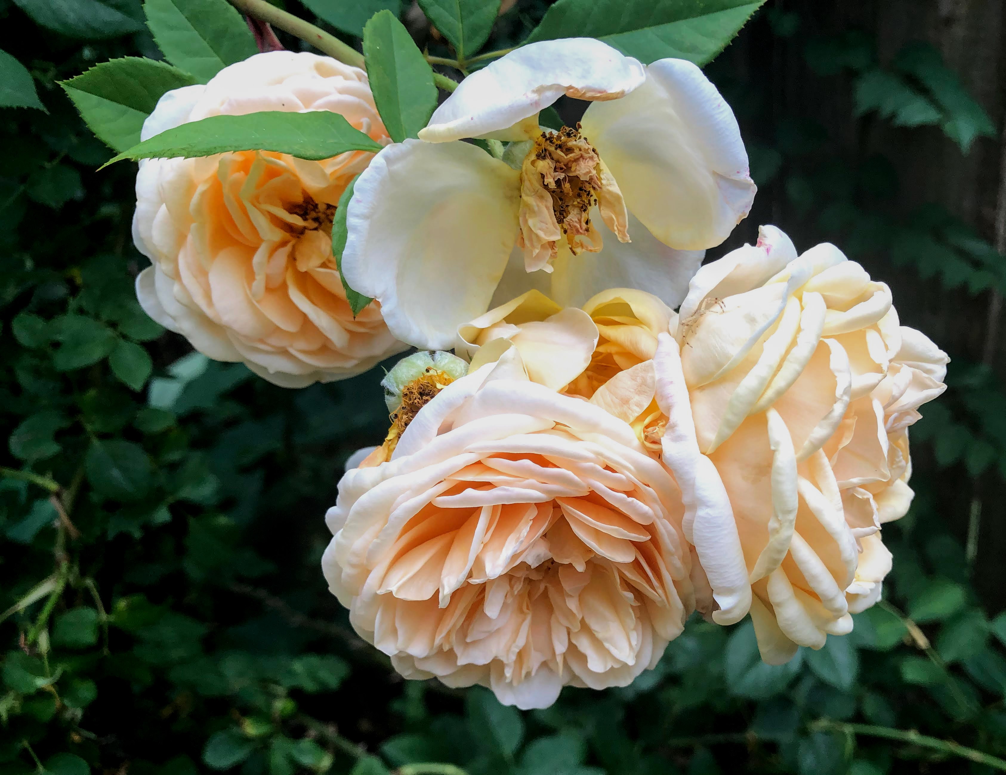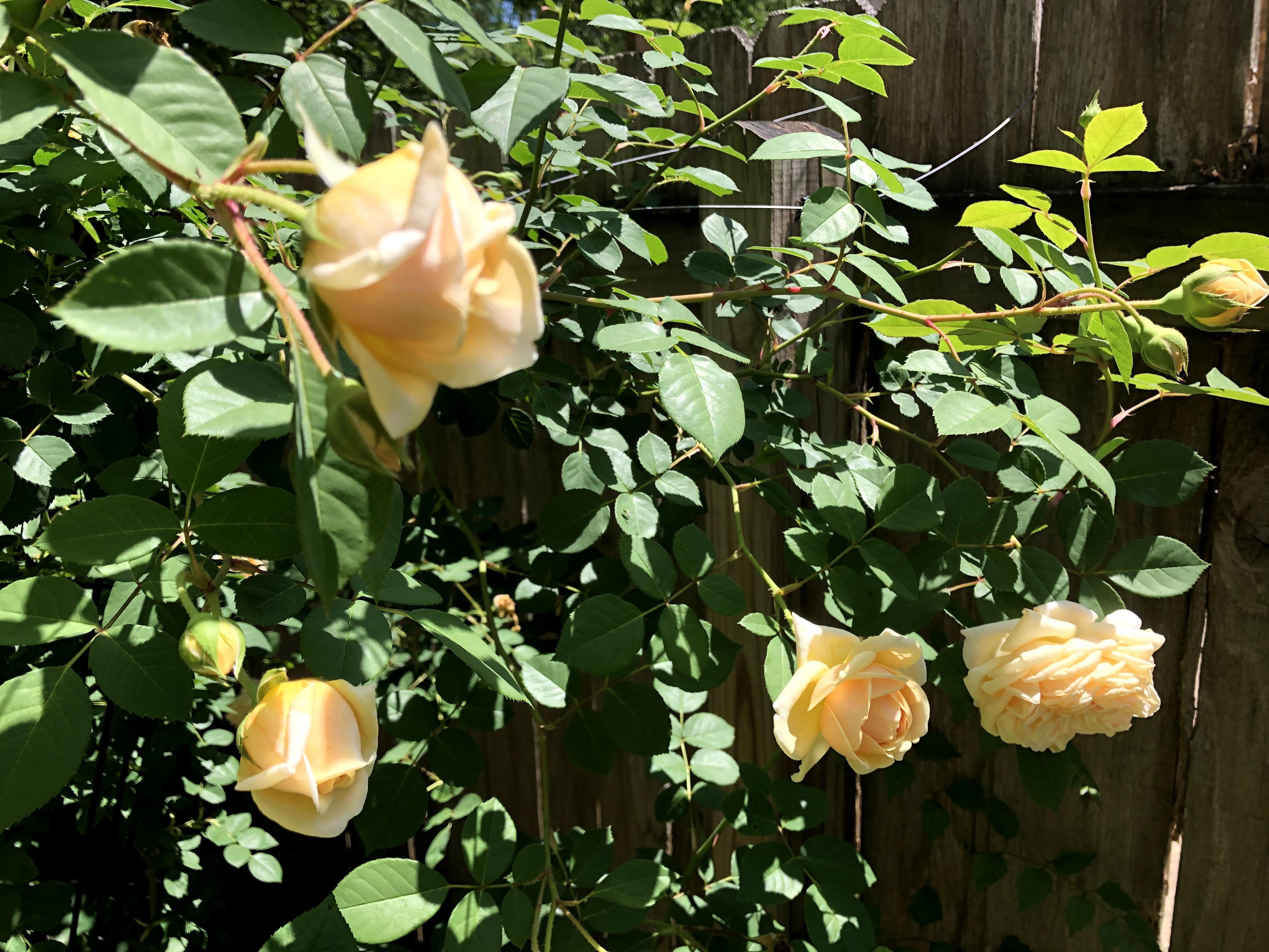 The pictures below feature two quite different kinds of roses from my yard this April. The red roses are “Knockout” roses, which are hardy, disease resistant, and repeat bloomers. All the other pictures show English roses that are fancier, but require a bit more tending.