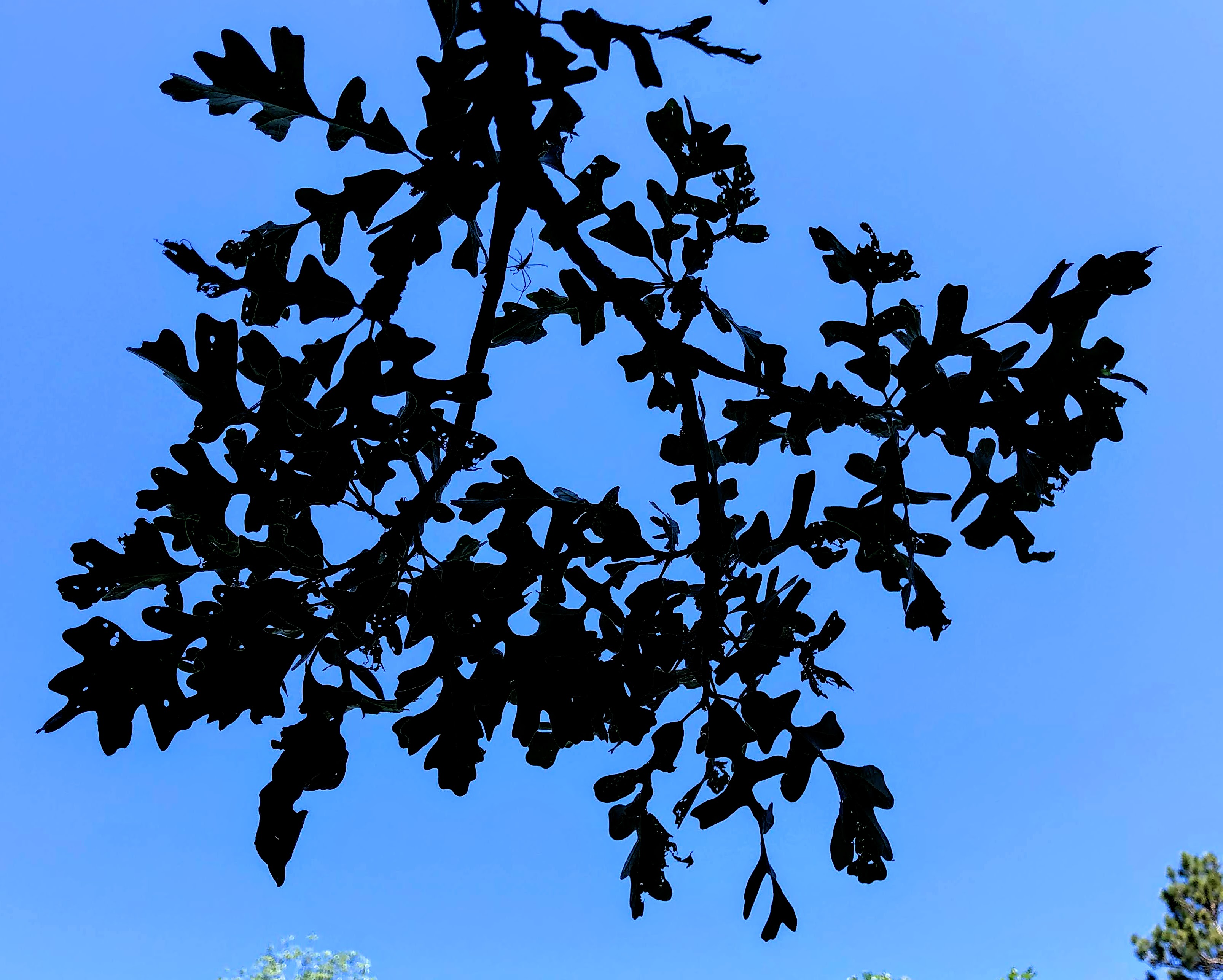 The images below compare a Bur Oak nearly leafless in mid-May and later in mid-June with its full complement of leaves.