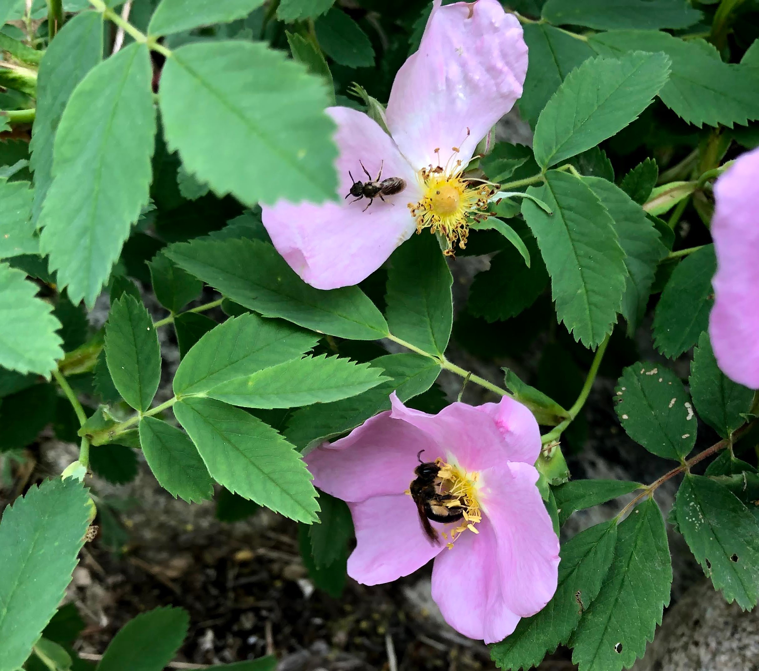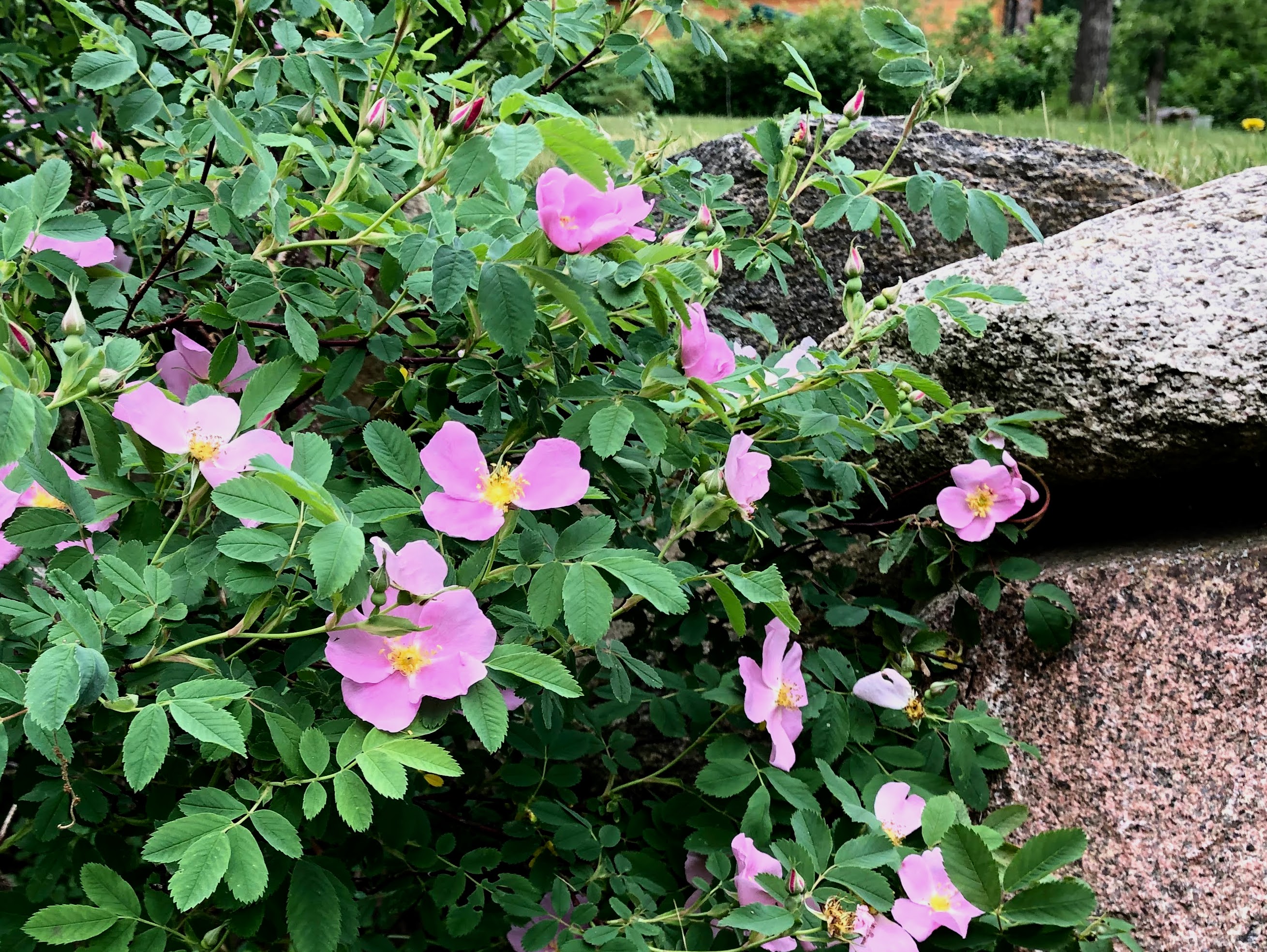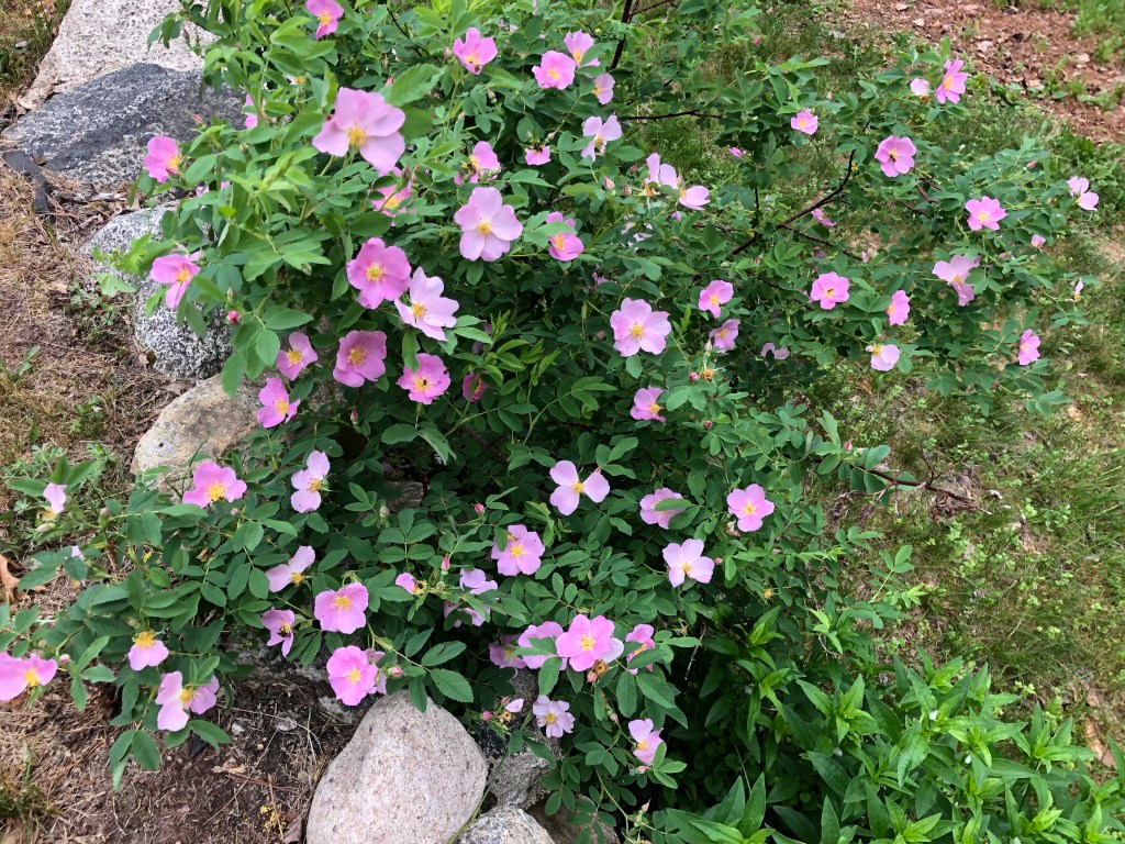 Alternatively, there are roses that grow wild in our area that thrive with very little care. The pictures below are of a wild rose bush moved from our woods to become part of our landscaping. It is most likely a Smooth Wild Rose (Rosa blanda), although it could be either of two very similar species, a Prairie Rose (Rosa arkansana) or a Wood’s Wild Rose (Rosa woodsii)