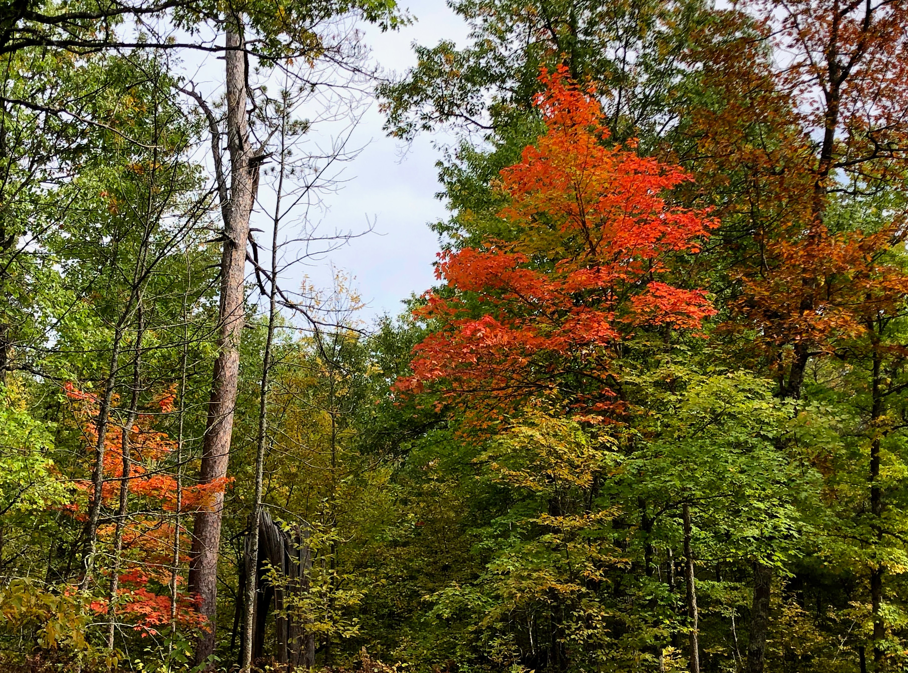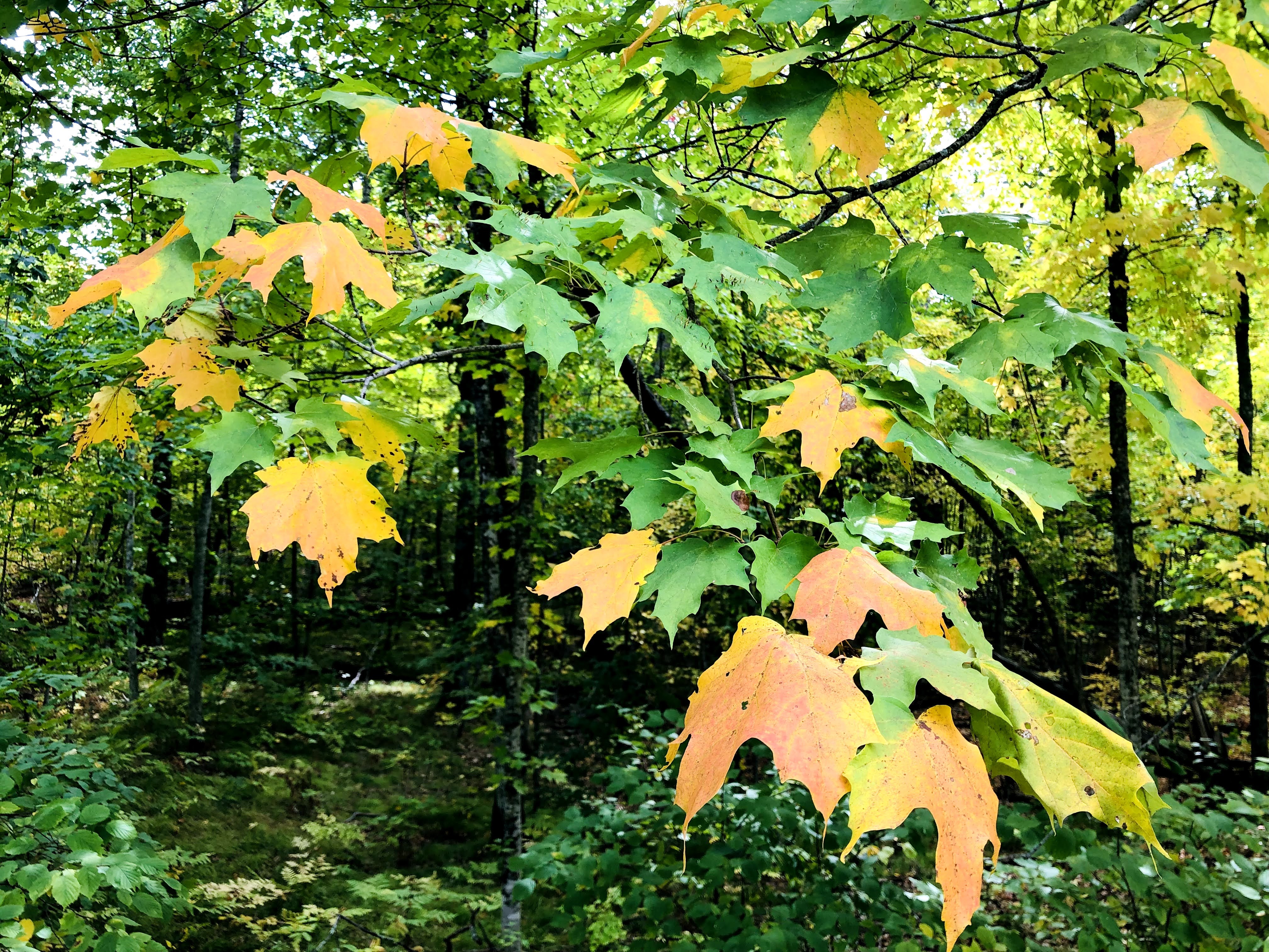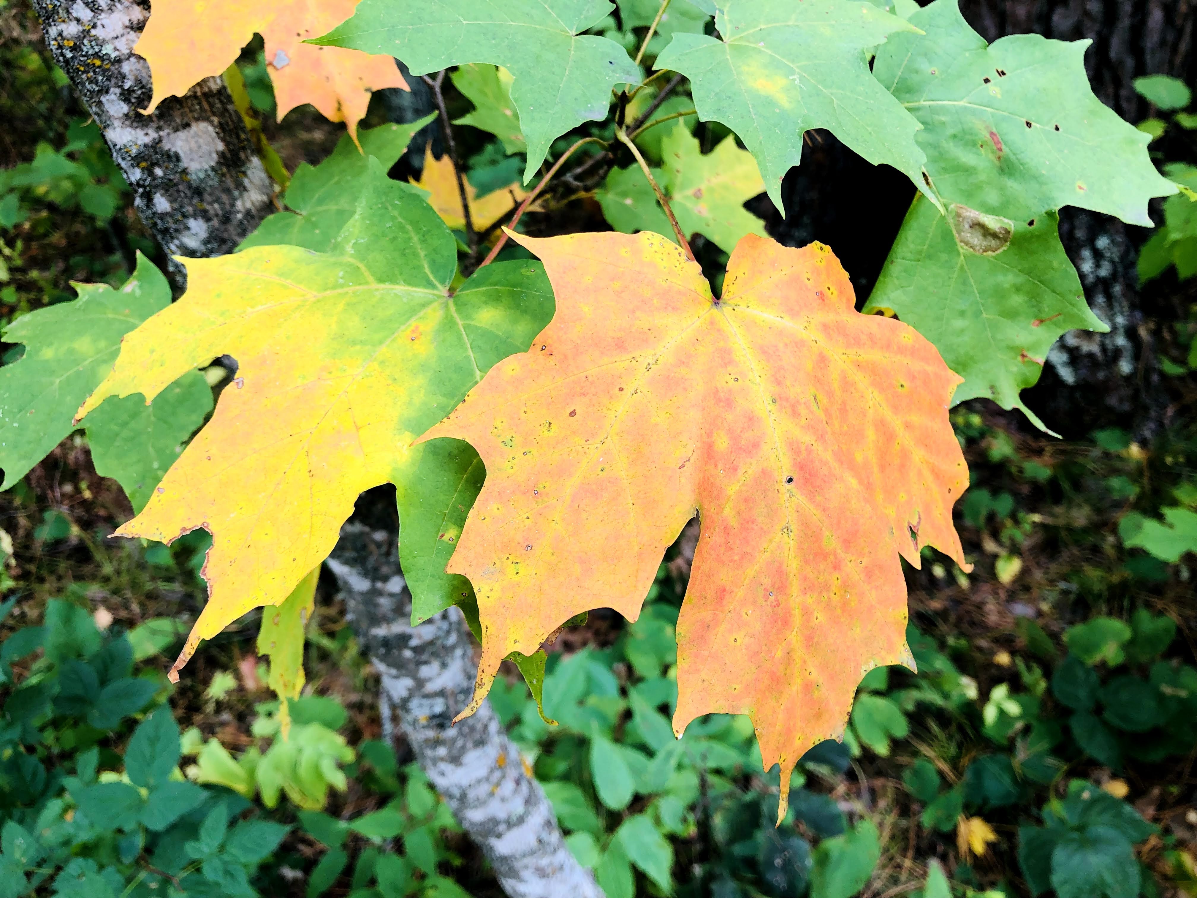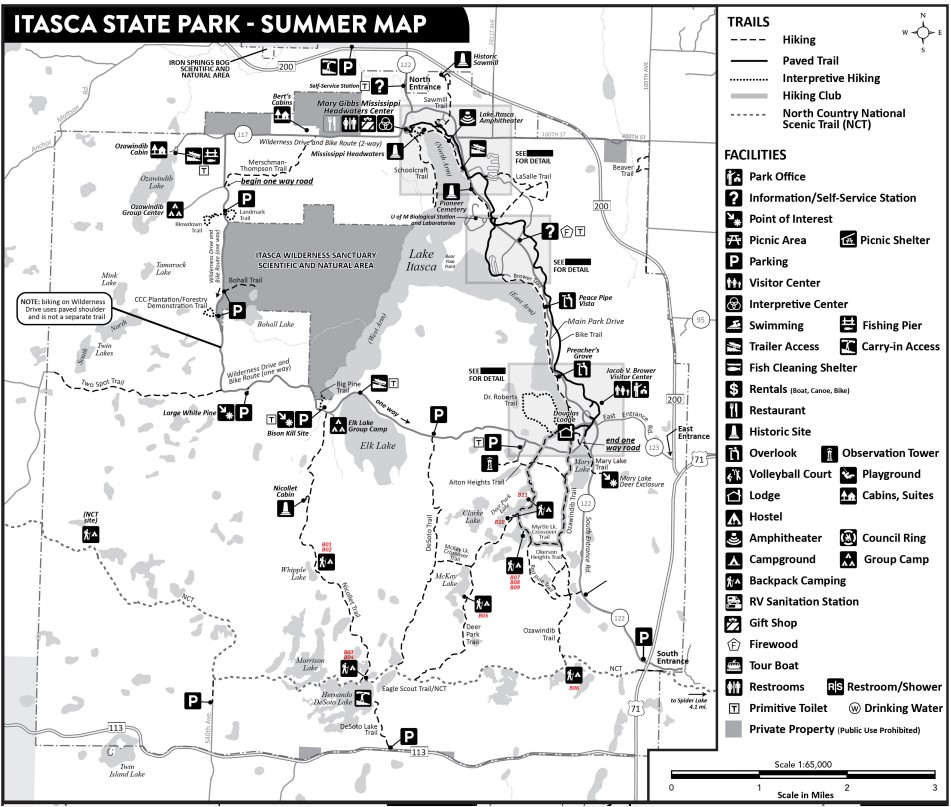 Although it is not yet officially fall, the changing leaves on maple trees in the park were gorgeous on our visit there yesterday, September 19th. We rode our bikes on the 5-mile trail that goes along the eastern shore of Lake Itasca from the Brower Visitor Center to the Mississippi Headwaters, as is shown on the map below. We saw beautiful maple trees mostly along the southern half of this route, oak and aspen trees with leaves turning yellow were seen throughout.