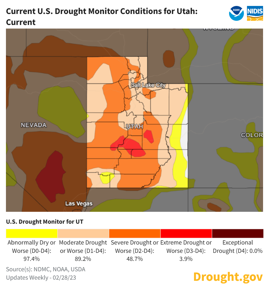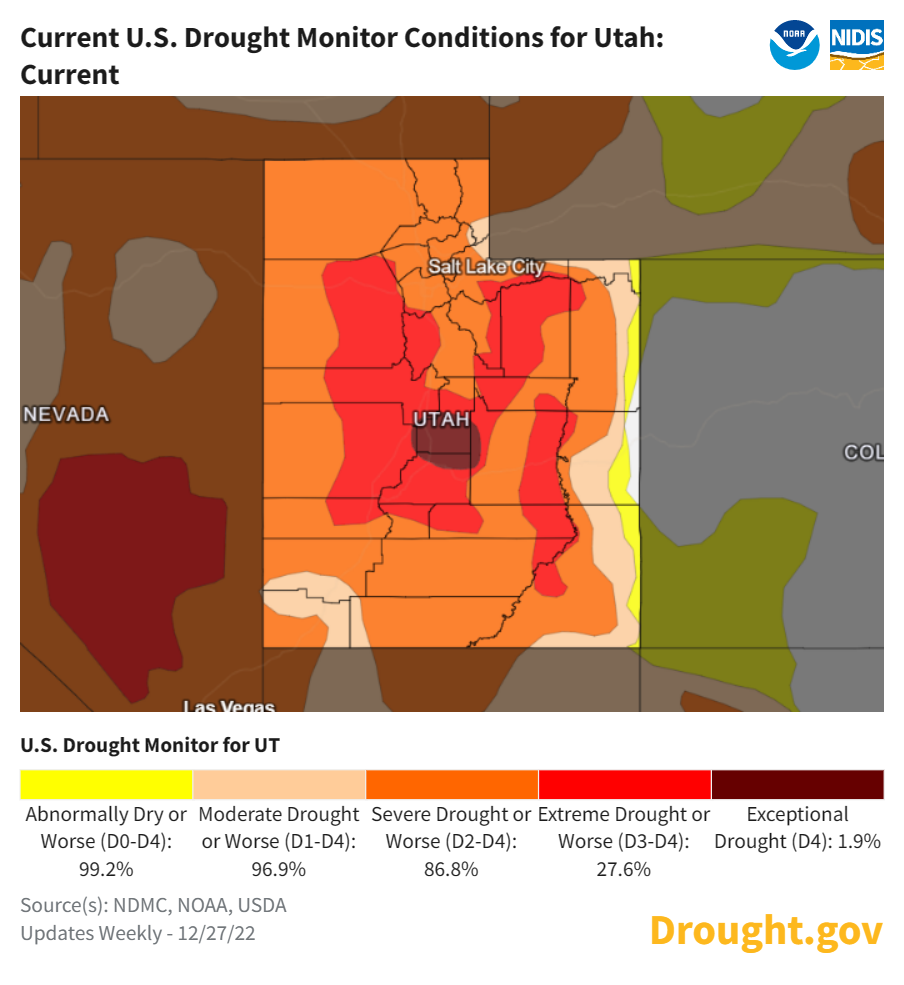 This snowy winter has improved Utah’s drought conditions, as can be seen by comparing the drought severity maps from December 27, 2022, and February 28, 2023. More than one snowy winter is needed though to address water issues like the drying up of the Great Salt Lake.