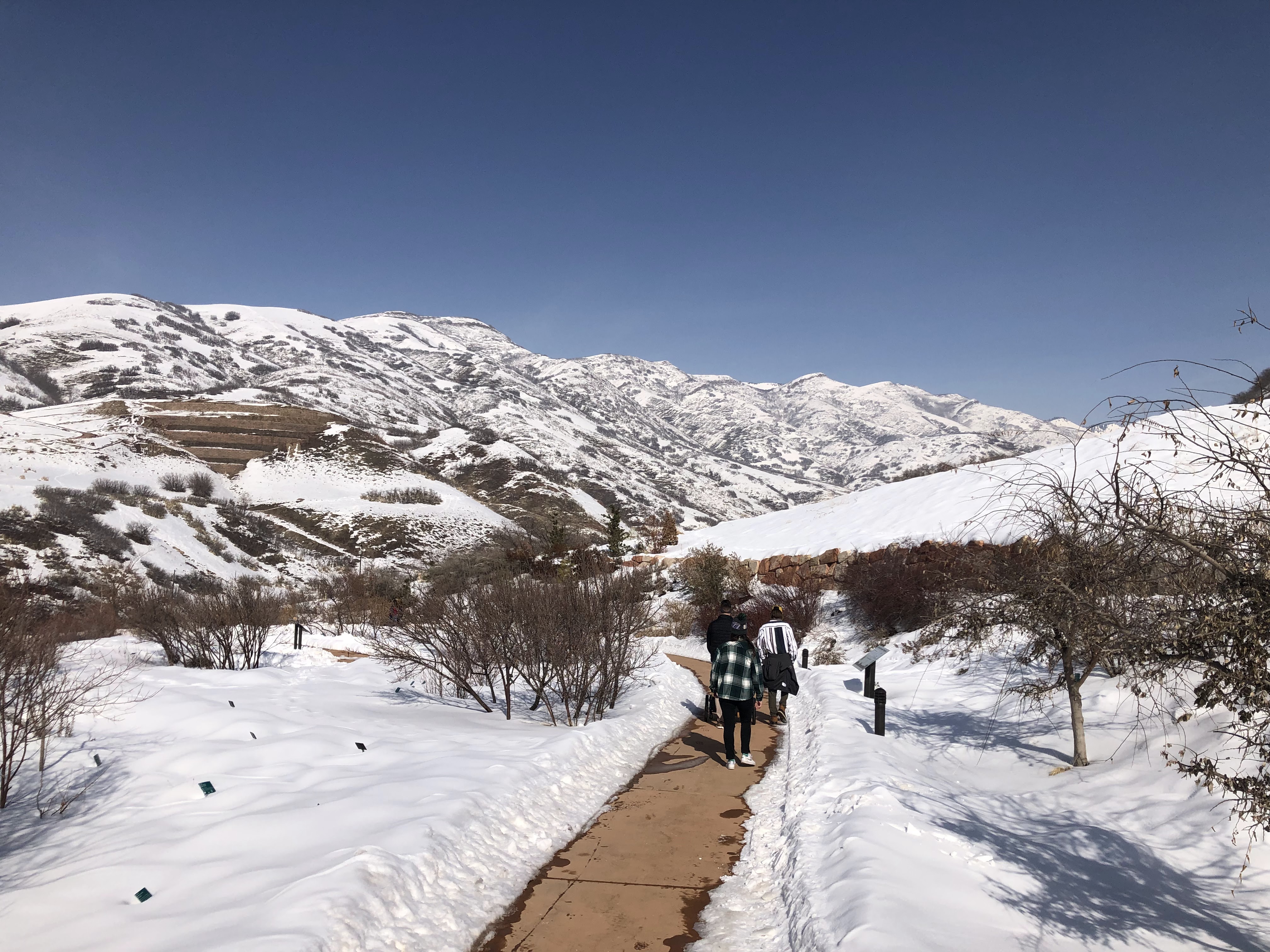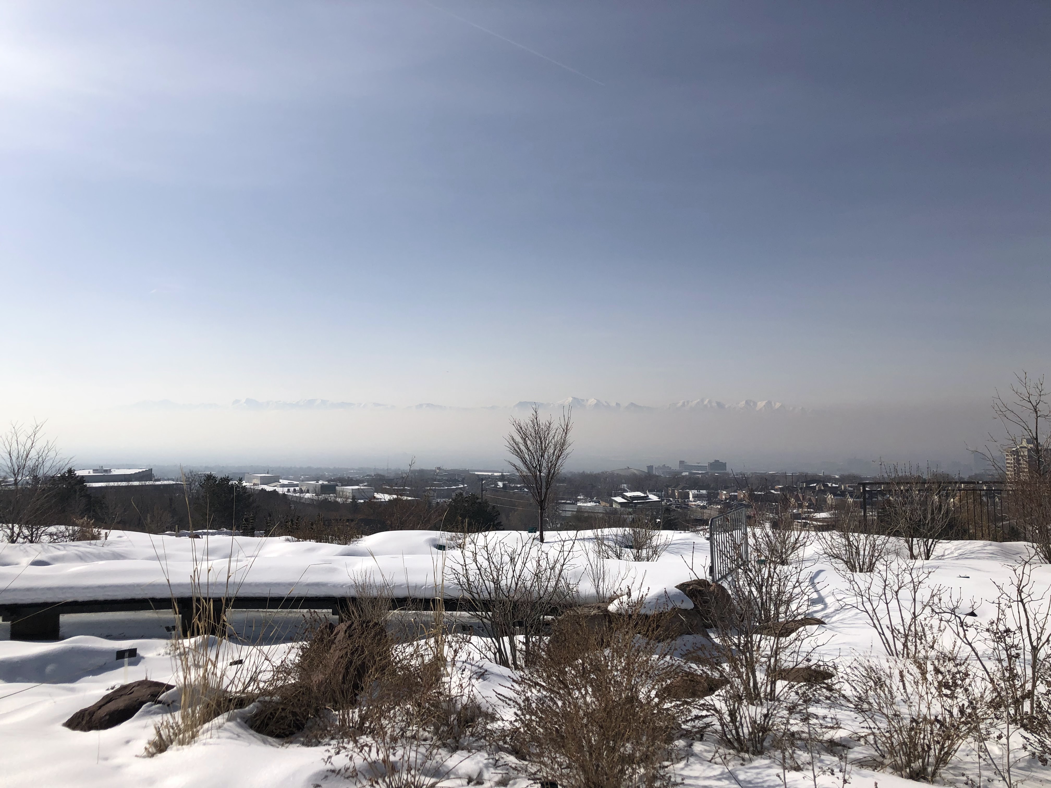 Snowy Red Butte Gardens, on the east side of SLC, February 4. Looking down on the city to the west the common winter haze is very evident. The haze is particularly bad during temperature inversions, when temperature at the surface of the SLC valley is colder than temperatures aloft.