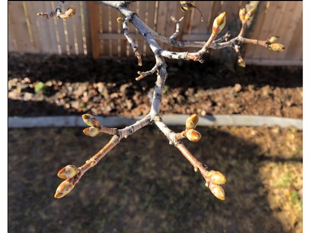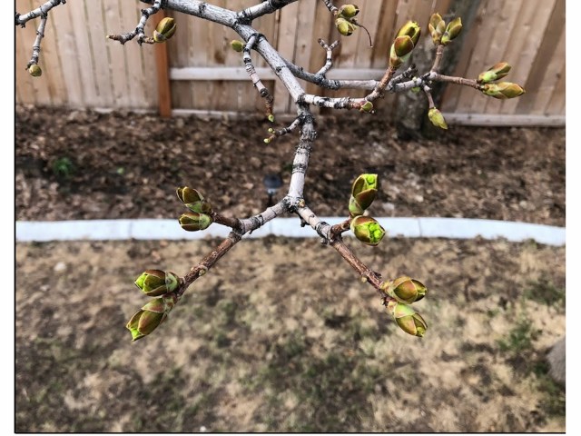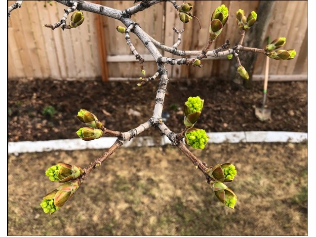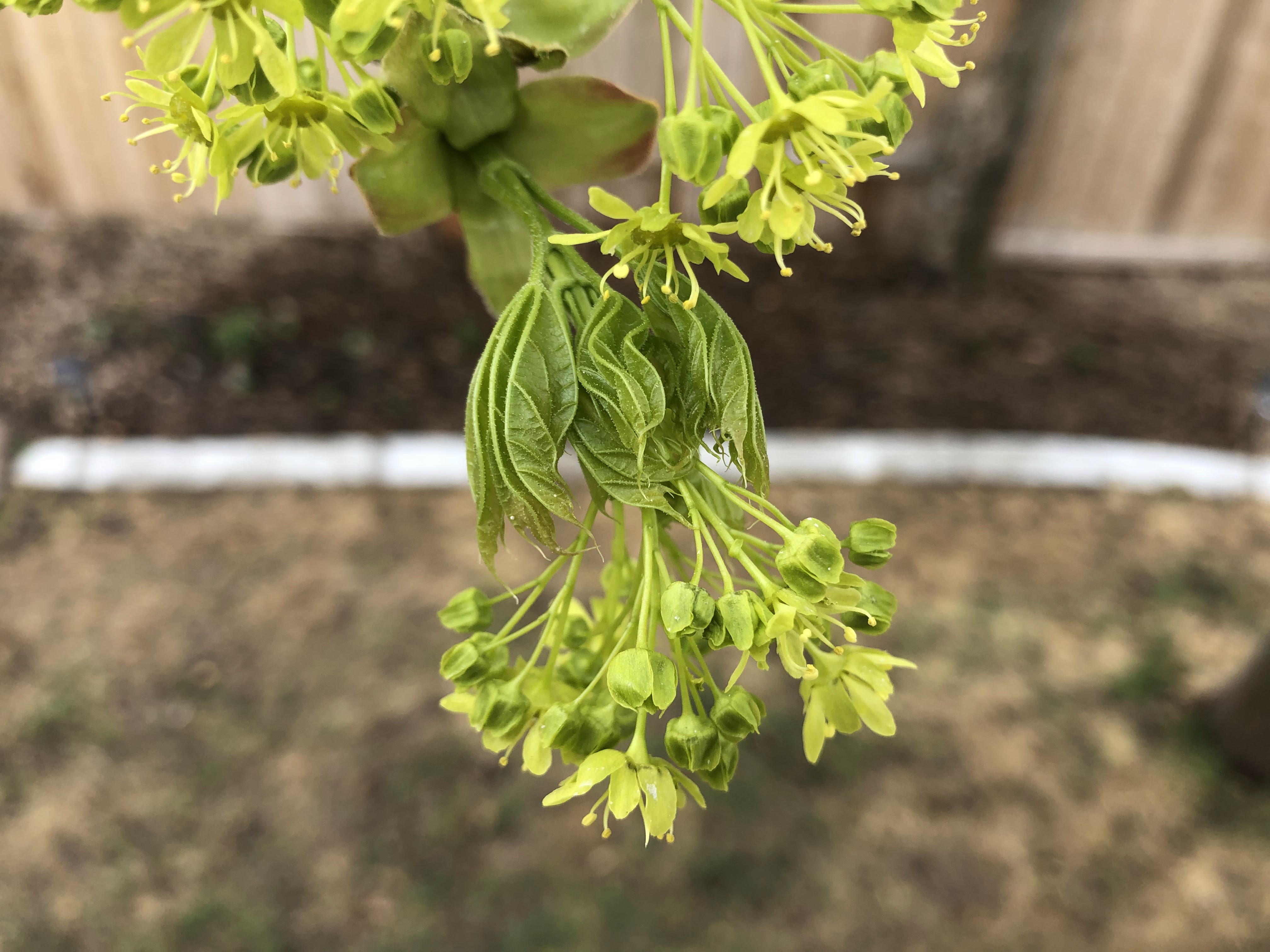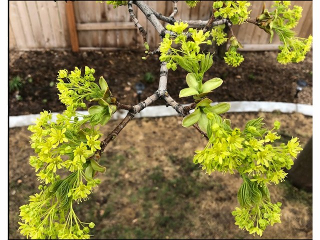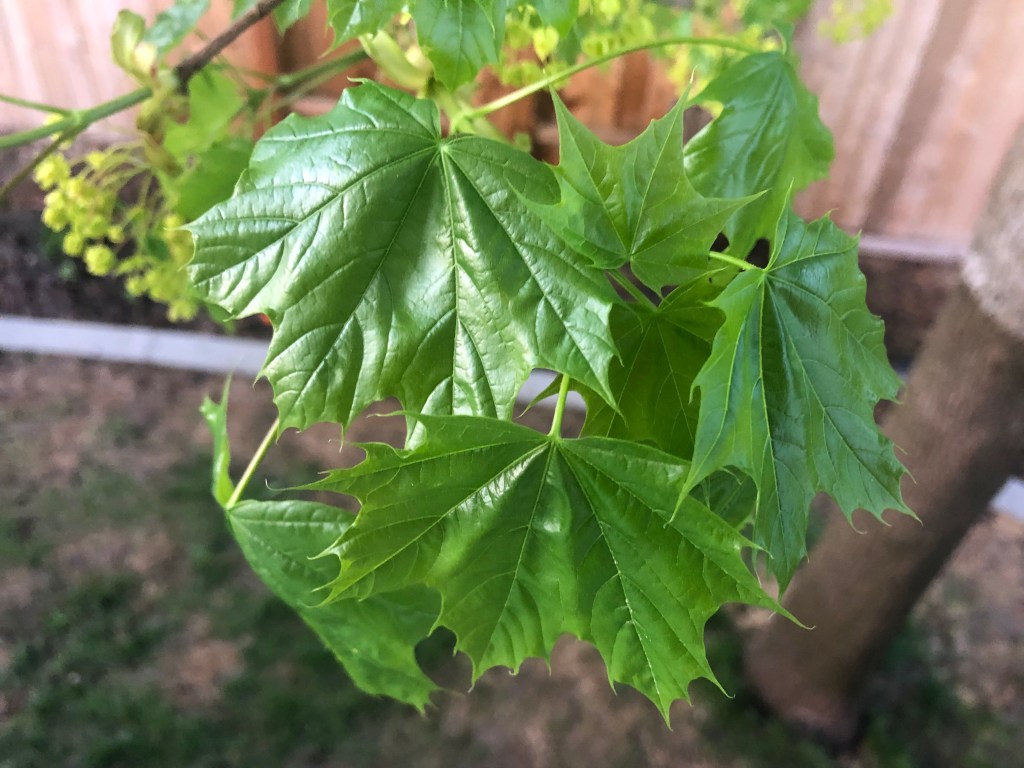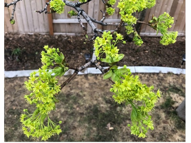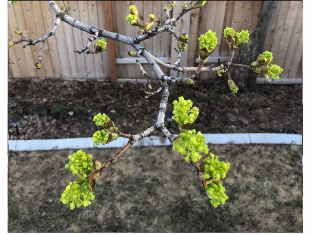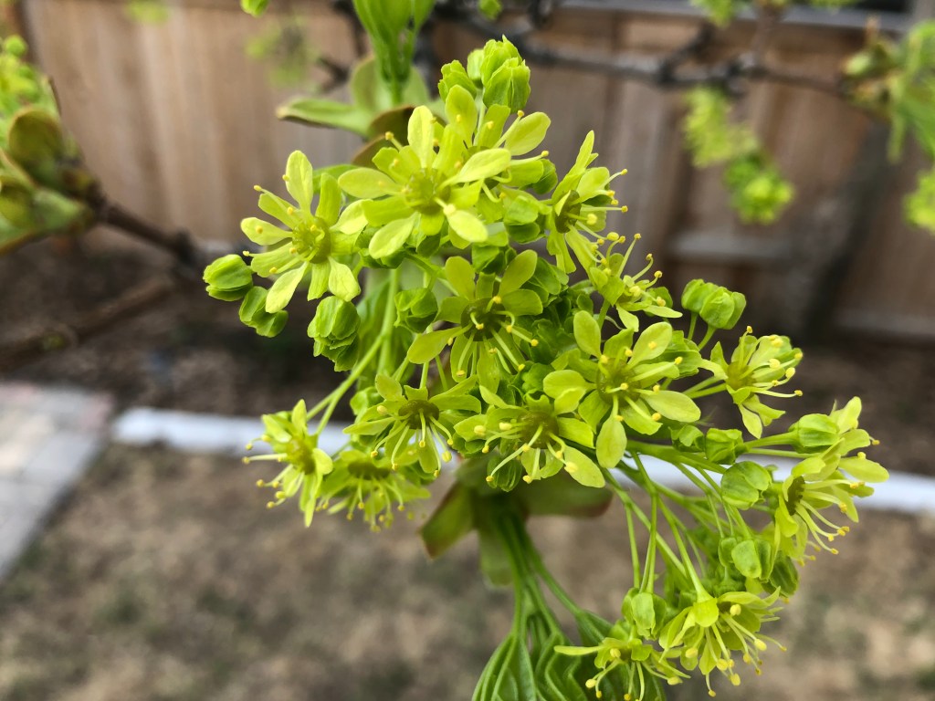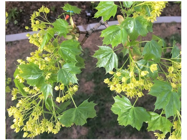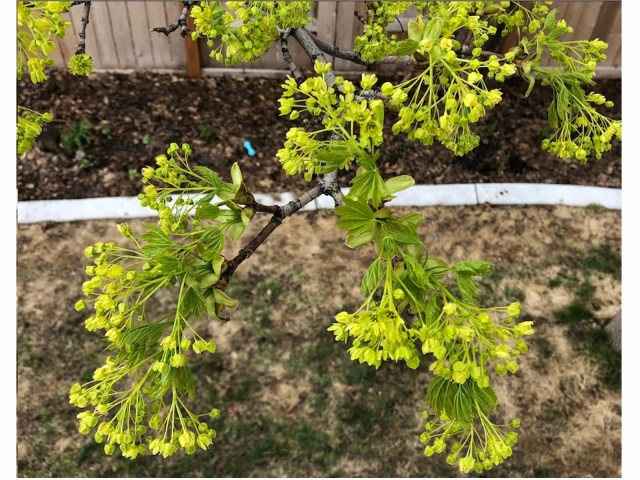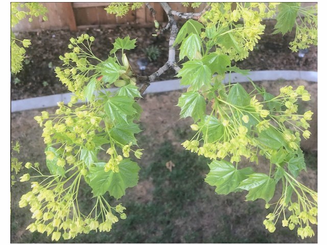 In springtime Norwegian Maples first produce clusters of small light-green flowers, followed by its new leaves. The slideshow below shows this progression of buds to flowers to leaves on one branch of our backyard tree from April 10-30.