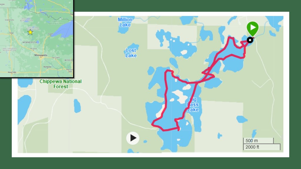 After relocating for the summer to our Minnesota cabin, on June 13 we brought kayaks to Big Bass Lake, in the Chippewa National Forest. The red line in the map above shows the route we took kayaking around the lake (Garmin GPS).