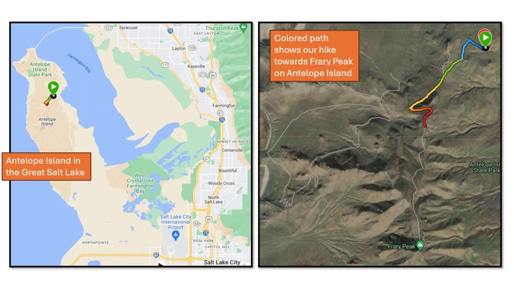 Antelope Island is a peninsula that juts out into the east side of the Great Salt Lake in Utah. The Utah State Park on Antelope Island is a short drive from Salt Lake City. Access to the park across a causeway is seen in the picture above.