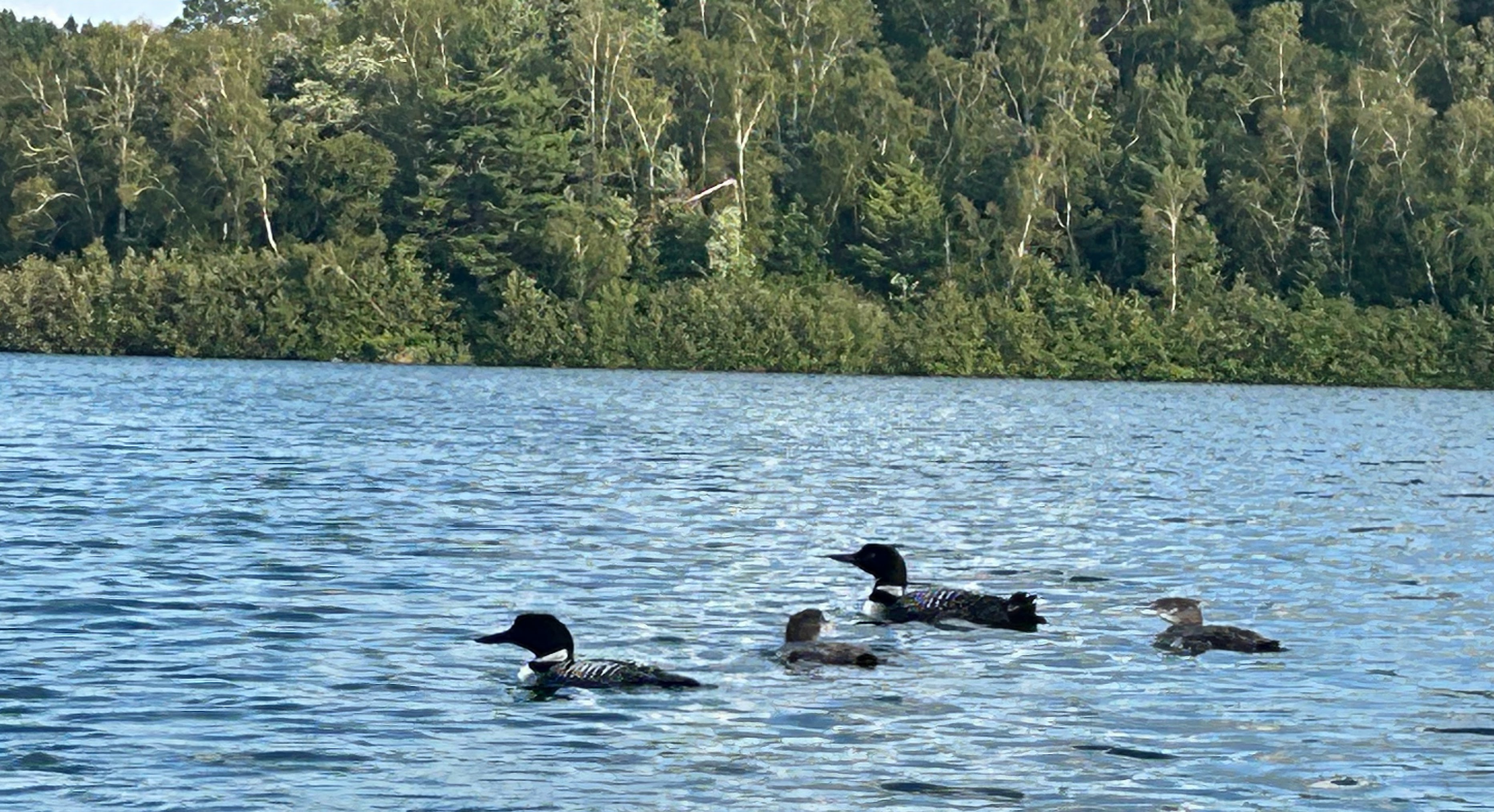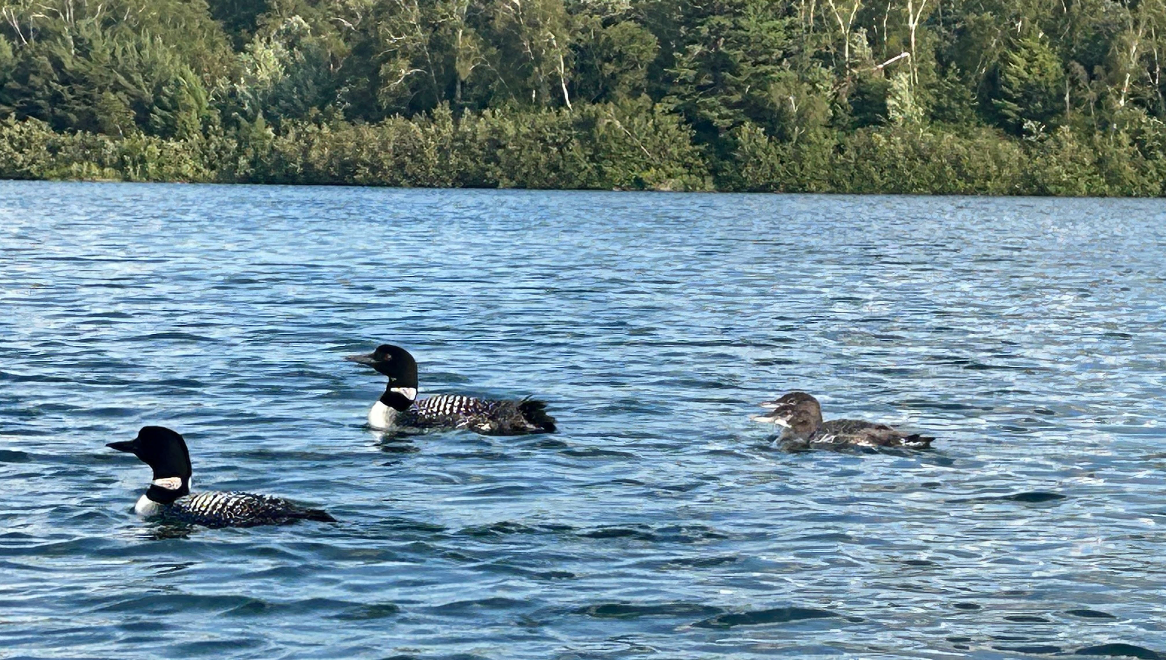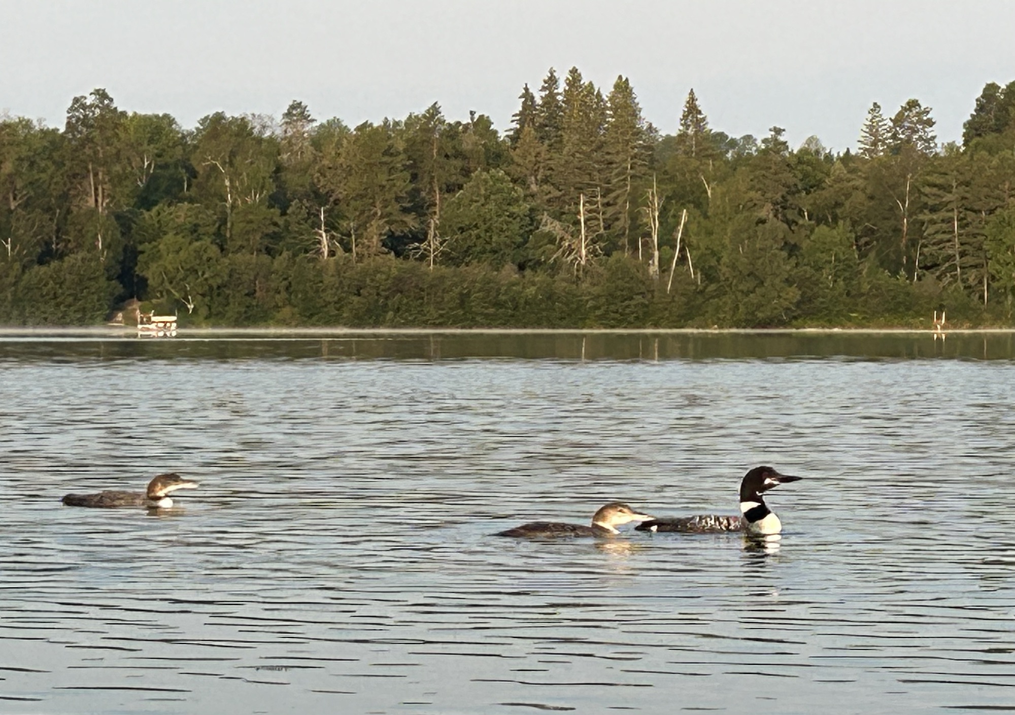 This year the nesting pair of loons on our lake raised two chicks. Below, these pictures of them were taken July 16.