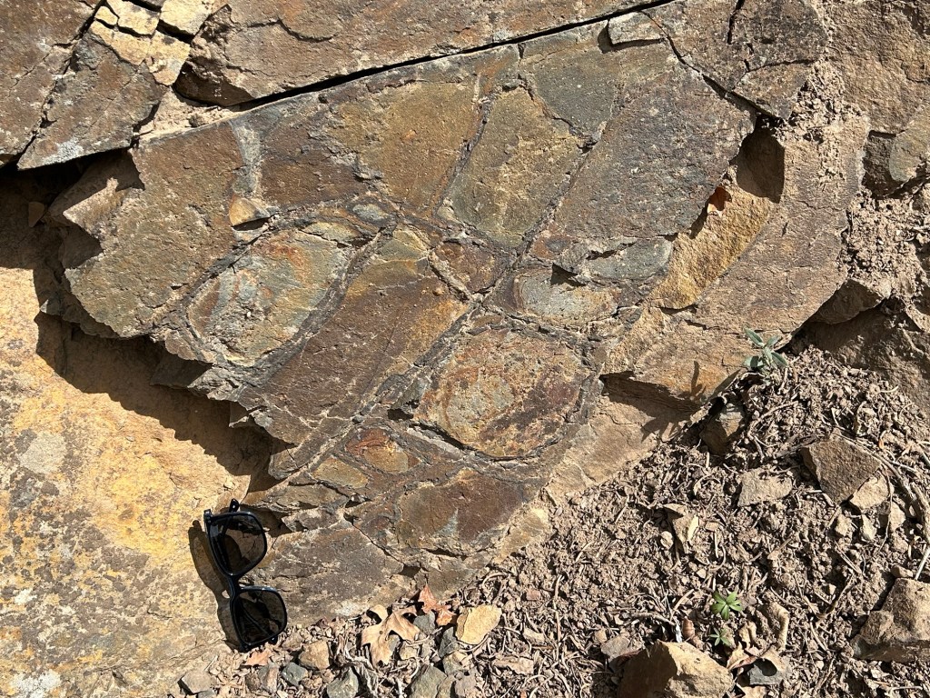 Tillite is a rock type that is interpreted as being deposited by glacial processes. The diagnostic feature of Tillite is large rock clasts embedded in fine grained rock matrix. It is thought that deposition of such large clasts requires transport by ice. The image above is of rock along the trail that I believe to be Tillite, large clasts are evident in the dark fine-grained matrix.