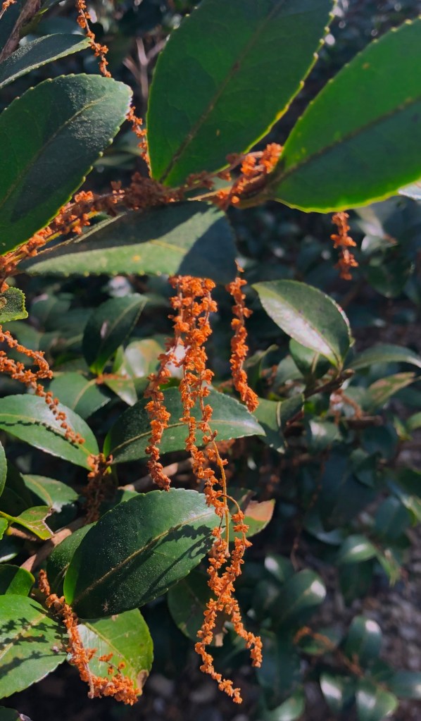 Here is a closer view of the flowers (catkins) of the Cherrybark Oak, fallen and draped over a camellia bush. In early March catkins drop from the oak, creating quite a mess and filling the air with oak pollen.