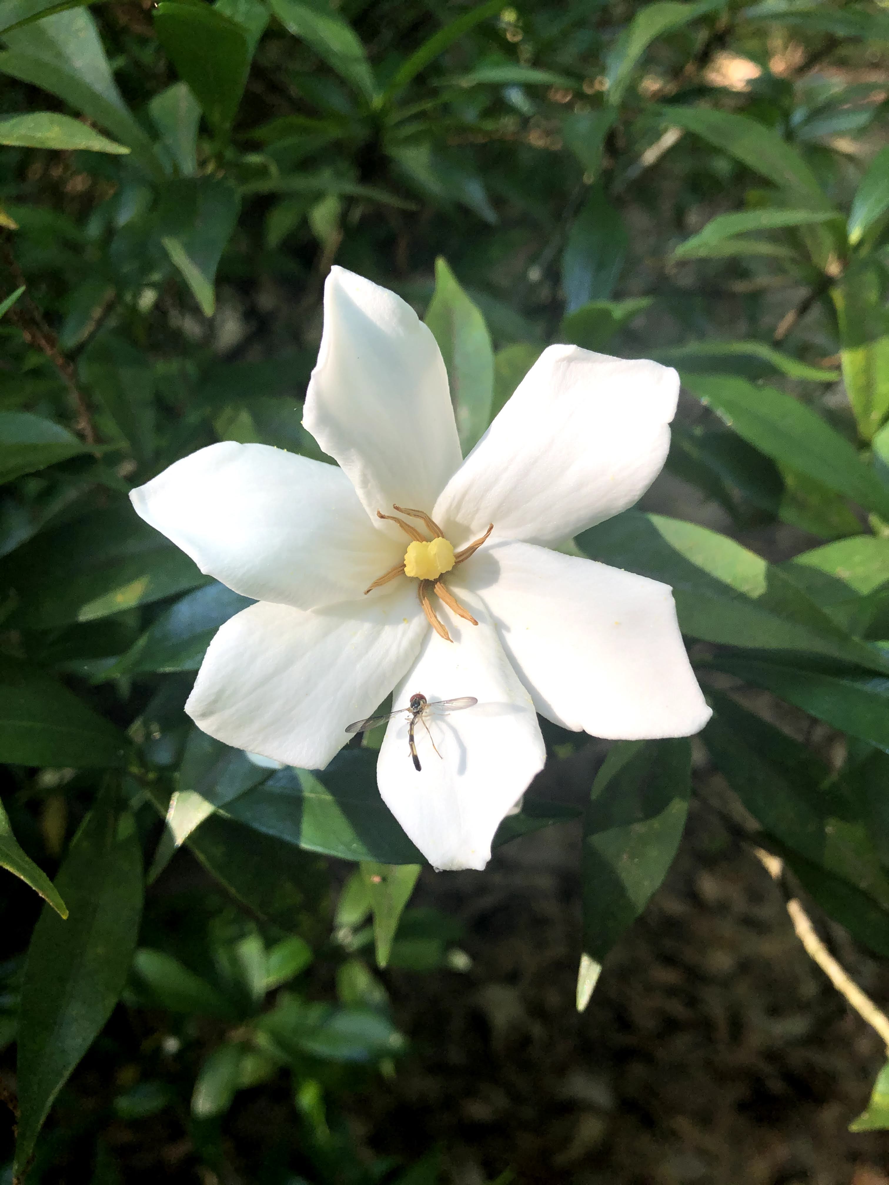 The “Insect ID” app identifies the insect on this gardenia bloom as a Eastern Band-winged hover Fly, Ocyptamus fascipennis. Hoverflies have mimicked the body shape of wasps and hornets, but are actually harmless. They are beneficial to garden plants because they feed on aphids and serve as pollinators.
