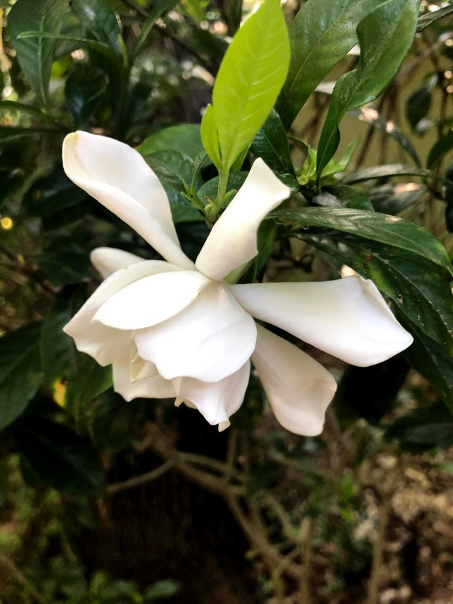 There are over 200 varieties of gardenia in a wide variety of sizes that are available for landscaping. As pictured above, we have several types thriving in our backyard. The scientific name for gardenia is Gardenia jasminoides; it is also called Cape Jasmine. However, it is actually in the family of coffee plants, Rubiaceae, while true jasmine is in the olive family, Oleaceae. Gardenia is native to SE Asia, and is now used worldwide in gardens in temperate to subtropical climates.