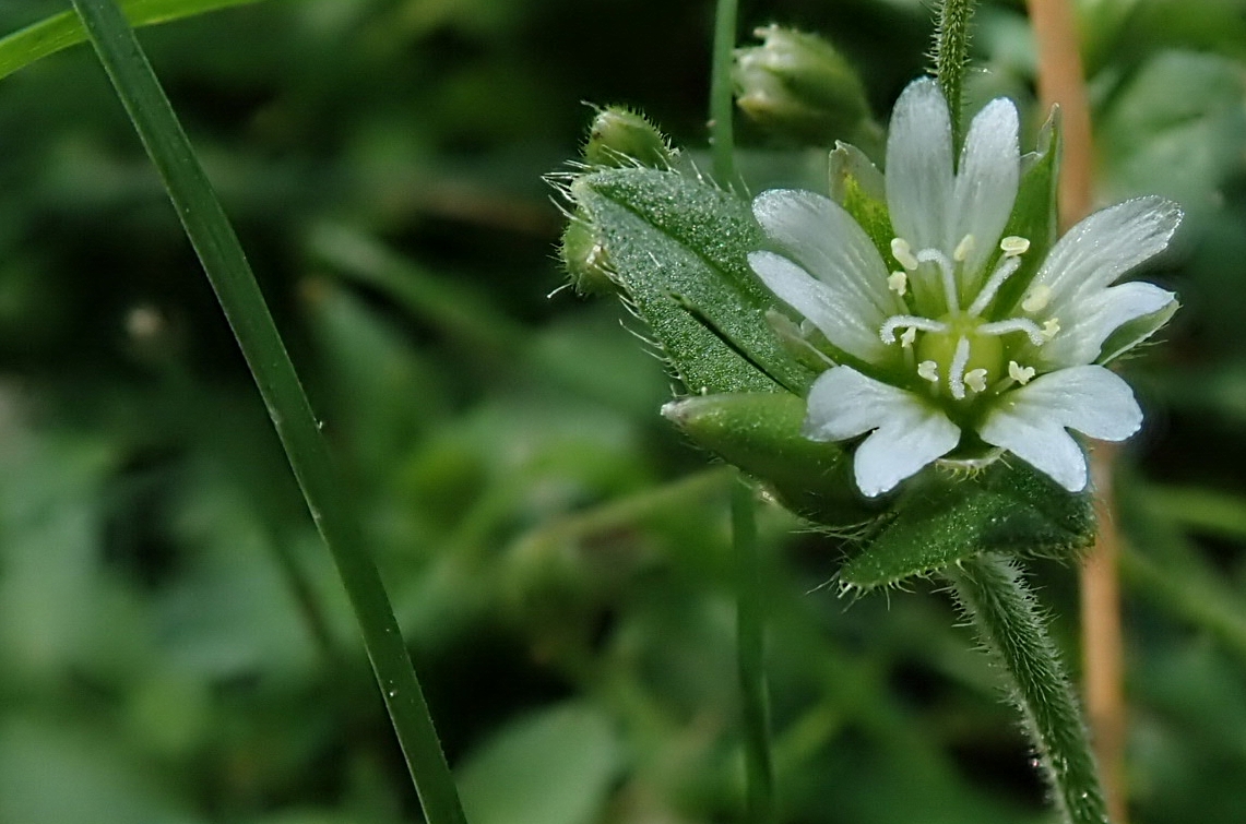 Mouse-ear chickweed is truly tiny, I found it hidden amongst the grass on our lawn. For scale, compare it to the blades of grass seen in the pictures above.