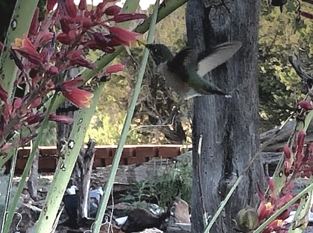 Last week on a road trip from Houston to Salt Lake City, we were lucky to see some hummingbirds feeding on yucca flowers near Santa Fe, New Mexico. There are many species of hummingbird in this area; the one in the picture above looks like a Black-Chinned Hummingbird (?).