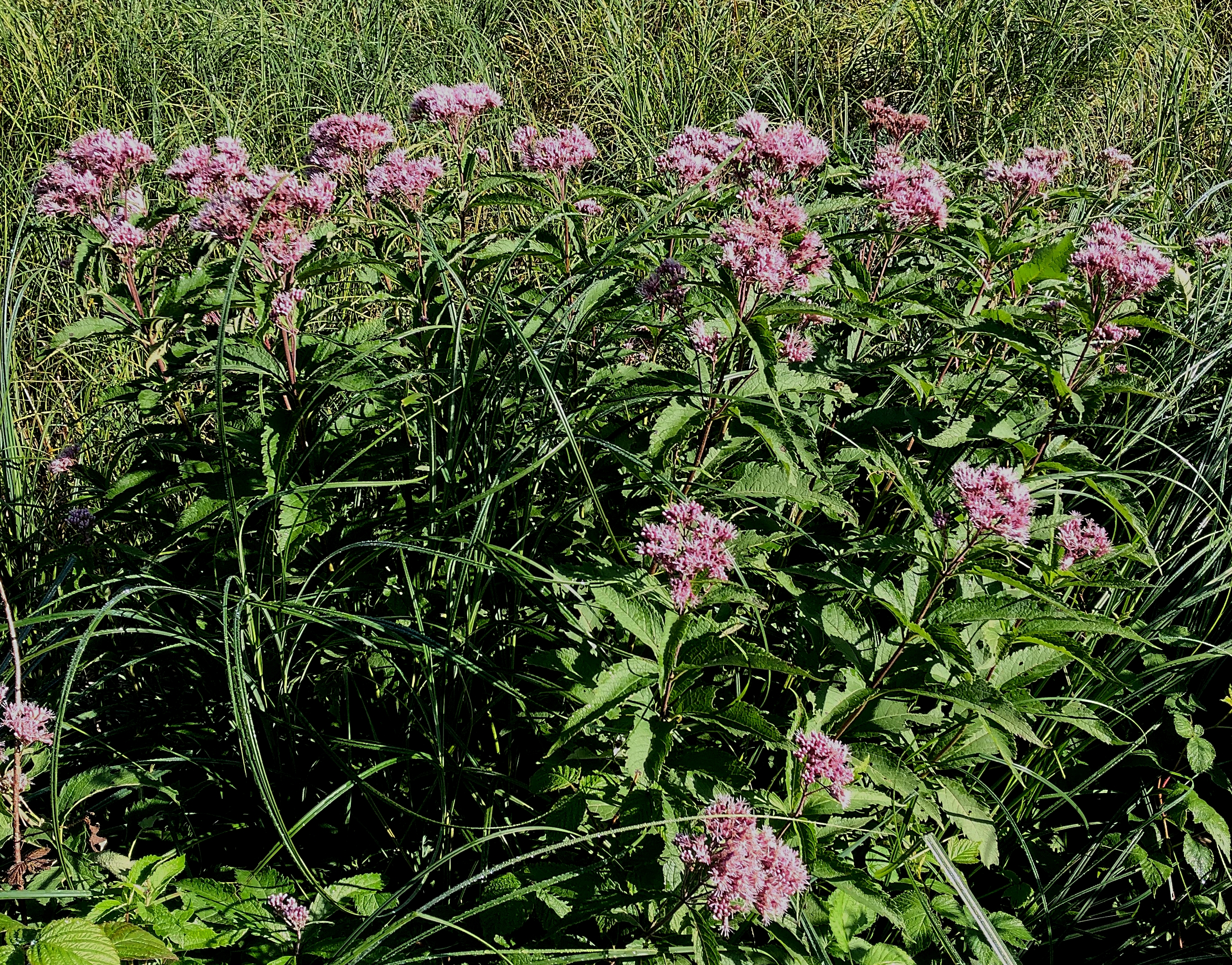 Joe-Pye Weed was found growing along a nearby roadside in a lower marshy spot. From a distance it appears similar to a milkweed. Because the plants did not have spots on the stems, they are likely Sweet-Scented Joe-Pye Weed rather than the similar Spotted species.