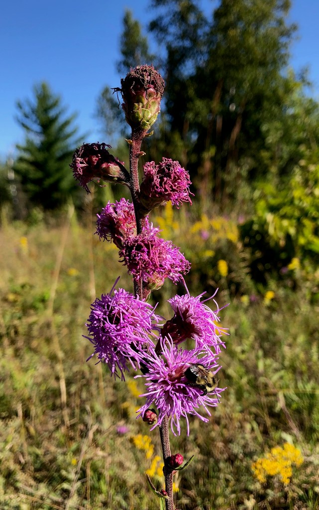 There are 5 species of Blazing Star in Minnesota. The Northern Plains Blazing Star is similar to the Rough Blazing Star, but commonly has its flowers on stalks. All Blazing Star flowers are very attractive to butterflies, hummingbirds and bees; and are offered by nurseries specializing in native plants.