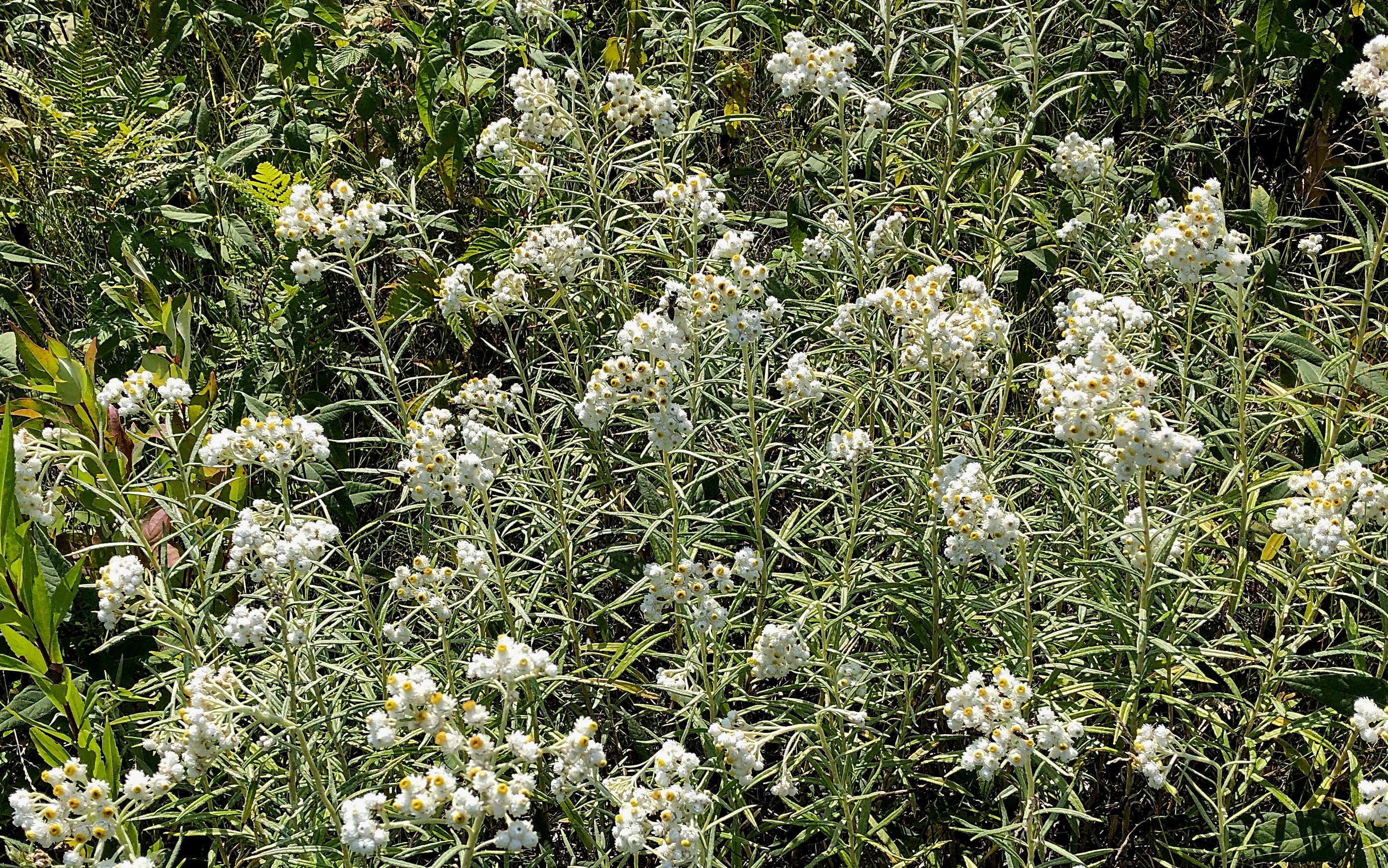 Rabbit Tobacco is an interesting plant. A commonly-used alternate name is Sweet Everlasting; because its flowers are long-lasting and it reportedly gives off a sweet, maple-like scent. Its flowers are the yellow-brown parts seen at the tips of the plant in the photos above. The white petal-like structures surrounding the flower are actually bracts.