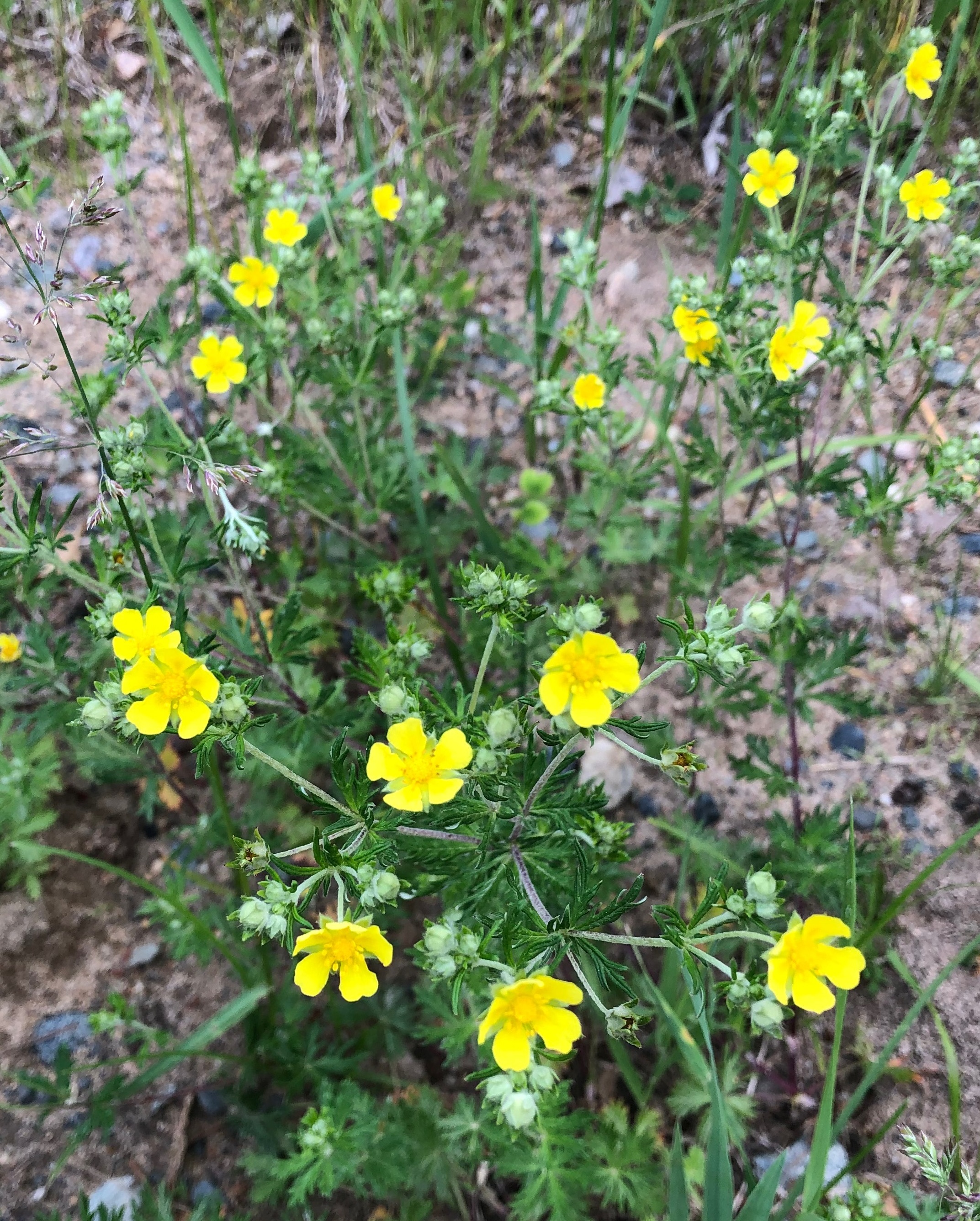 Silver cinquefoil is one of the 300 species of potentilla. The undersides of its leaves are covered with silvery hair, which explains “silver” in its name. “Cinquefoil” comes from the Old French “cinc” (five) and “feuille” (leaf), so; five-leafed. Cinquefoils grow wild in most of the cooler regions of the world.